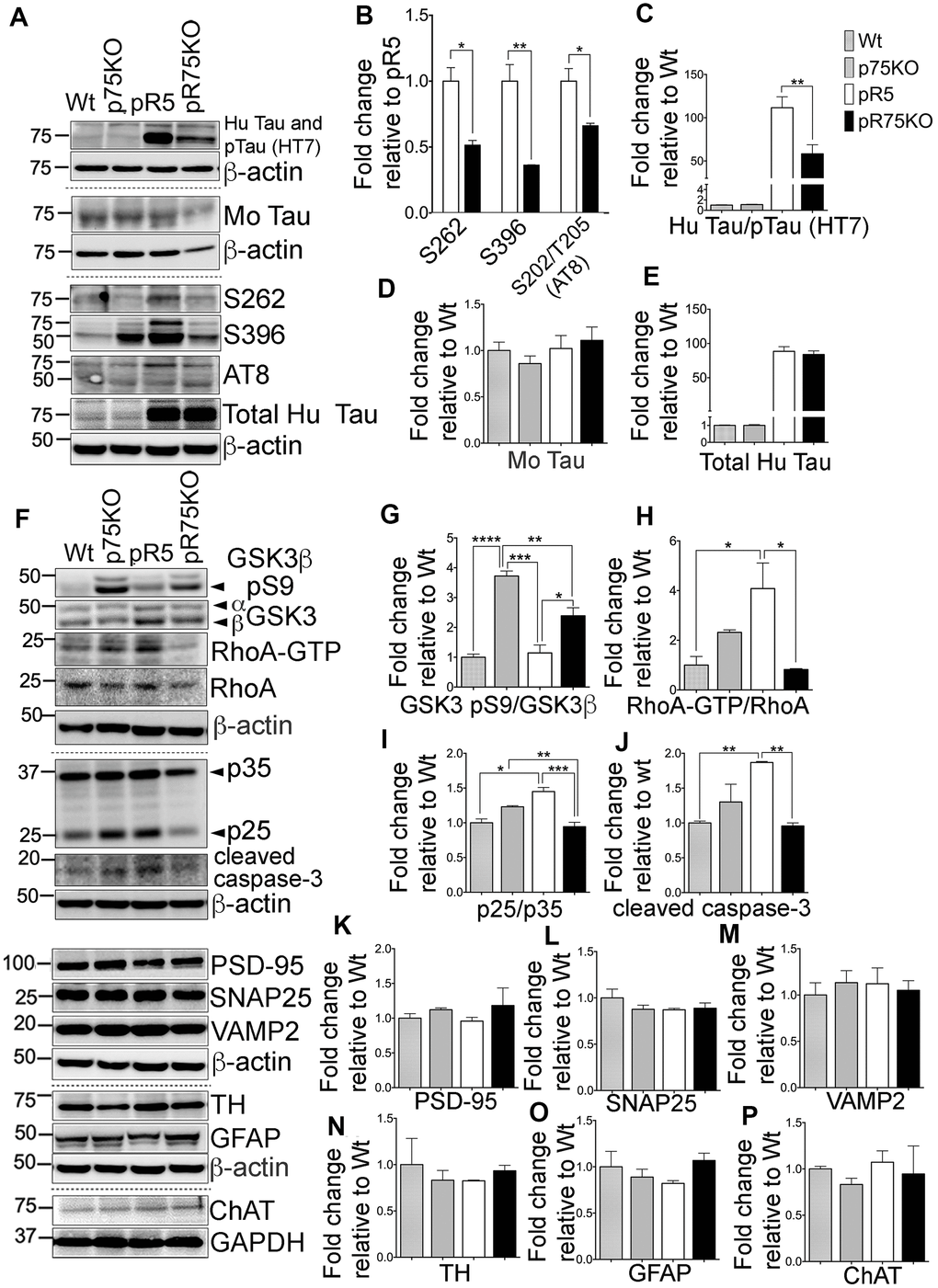 Reduction of Tau phosphorylation, and kinase activities in pR75KO mice at 9 months of age