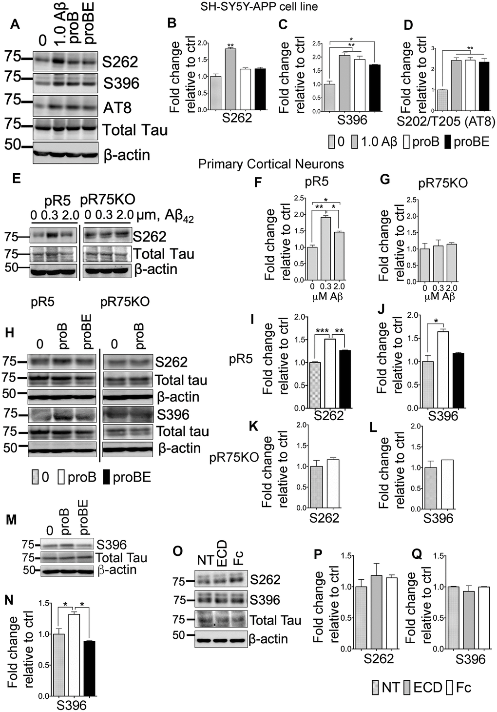 Amyloid beta induces Tau hyperphosphorylation, neurite degeneration and neurotoxicity, leading to AD [51–53]. The neurotoxic activity of Aβ is in part through p75NTR [54–57]. p75NTR is also a receptor to neurotrophins such as proBDNF. It is reported that proBDNF binds to p75NTR with greater affinity than mature neurotrophins [58, 59], inducing apoptosis by activating the receptor complex, p75NTR and sortilin [58]. Therefore, we investigated whether Aβ and proBDNF has a role in p75NTR-dependent Tau phosphorylation using SH-SY5Y-APP cells and primary cortical neurons, isolated from pR5 and pR75KO mice. We treated SH-SY5Y-APP with Aβ42, proBDNF and a p75NTR antagonist, p75ECD-Fc (ECD). SH-SY5Y-APP cells were exposed to 1.0 μM Aβ, 30 ng/mL proBDNF (proB) and 30 ng/mL proBDNF with 10 μg/mL p75ECD-Fc (proBE) for 24 hours. The levels of phosphorylated Tau were determined by western blotting (Figure 5A). Amyloid beta treatment significantly increased hyperphosphorylation of human Tau at sites S262 (Figure 5B, p=0.0014), S396 (Figure 5C, p=0.0053) and AT8 (Figure 5D, p=0.0049) compared to non-treated SH-SY5Y-APP cells. ProBDNF treatment increased S396 (Figure 5C, p=0.0093) and S202/T205 (AT8) (Figure 5D, p=0.0047) compared to non-treated SH-SY5Y-APP cells. On the other hand, p75ECD-Fc treatment does not seem to reduce proBDNF-induced phosphorylation of Tau in these cells. Next, we also treated cortical neurons from pR5 and pR75KO mice with different doses of Aβ (0.3 μM, 2.0 μM) (Figure 5E). Amyloid beta increased S262 levels in pR5 cortical neurons at both concentrations at 0.3 μM compared to Wt (Figure 5F, p=0.0026) but not in cortical neurons of pR75KO mice (Figure 5G). Similarly, proBDNF increased S262 (p=0.0001) (Figure 5I) and S396 (Figure 5J, p=0.0260) in pR5 neurons but not pR75KO neurons (Figure 5K, 5L) compared to non-treated cortical neurons. The addition of p75ECD-Fc attenuated S262 levels (Figure 5I, p=0.0016). However, the phosphorylation at S396 after proBDNF and p75ECD-Fc seemed to be reduced but did not reach statistical significance (p=0.0612) in pR5 neurons (Figure 5J). We also investigated the effect of proBDNF on mouse Tau phosphorylated at S396 using Wt neurons and we also found that proBDNF increased mouse Tau phosphorylation at S396 (p=0.0447) while the addition of p75ECD-Fc reversed the effect of proBDNF (p=0.0194) (Figure 5M, 5N). This indicates that Aβ- and proBDNF-induced Tau phosphorylation is specifically through p75NTR. To determine if p75ECD-Fc alone affects the basal level of phosphorylated Tau, we exposed pR5 neurons to 10 μg/mL of p75ECD-Fc and Human-Fc (negative control) (Figure 5O). We did not observe any effect on S262 and S396 levels (Figure 5P, 5Q). Overall, these results suggest that p75NTR is required for Aβ and proBDNF-induced phosphorylation of Tau.
