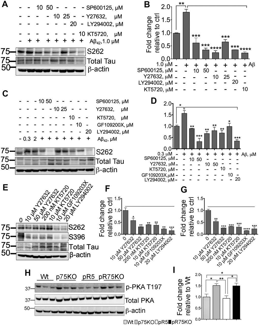 SH-SY5Y-APP cells were used to determine the role of kinases in Aβ-mediated Tau hyperphosphorylation. Cells were subsequently treated with 1.0 μM Aβ42 and with various kinase inhibitors for JNK (SP600125), ROCK (Y27632), PI3K (LY294002) and PKA (KT5720) at the indicated concentrations (Figure 6A). Tau phosphorylation at S262 was detected by western blotting and corrected per total human Tau protein. Our preliminary results showed that Aβ treatment significantly increased S262 phosphorylation (p=0.0016), but was reduced when treated by the kinase inhibitors (Figure 6B). This result suggests that Aβ-induced phosphorylation of Tau involves activity of JNK, ROCK, PKA and PKC in vitro. We further confirmed this result using pR5 primary cortical neurons. We found that inhibitors for JNK (SP600125: 10, 50 μM), ROCK (Y27632: 10, 50 μM), PKA (KT5720: 10 μM), PKC (GF109203X; 10 μM) and PI3K (LY294002; 20 μM) inhibited Aβ-mediated Tau phosphorylation (Figure 6C, 6D). To determine whether the kinase inhibitors affect the basal level of phosphorylated Tau at sites S262 and S396, we treated pR5 cortical neurons with inhibitors of ROCK (Y27632; 10, 50 μM), PKA (KT5720: 200 nM, 10 μM), PKC (GF109203X; 10 μM) and PI3K (LY294002; 20 μM) (Figure 6E). Interestingly, basal S262 levels (Figure 6F) and S396 (Figure 6G) were also significantly reduced, suggesting that Tau phosphorylation is mediated through these kinases.