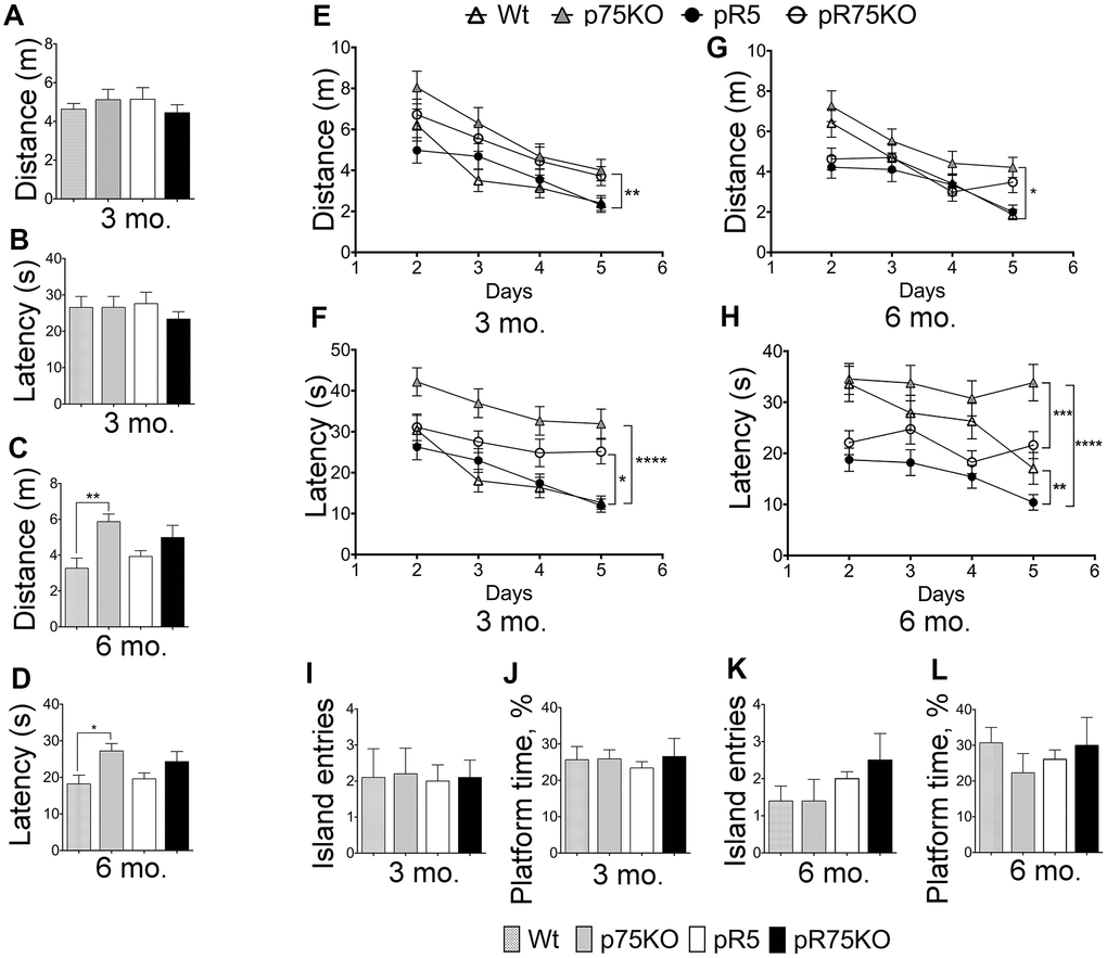 Training was done during the next 4 consecutive days with the platform submerged 1 cm below the surface. During the training, 3 months old p75KO mice covered the longest distance compared to Wt (p=0.0010) and pR5 (p=0.0016) while pR5 and pR75KO mice performed similarly to Wt mice (Figure 7E). The latency to find the platform of Wt and pR5 mice were comparable while p75KO (p<0.0001) and pR75KO mice (p=0.0256) had longer latency than Wt mice (Figure 7F). The swimming speeds of all mice groups were similar at 3 months of age (Supplementary Figure 6C). A change in behavior became apparent at 6 months of age. p75KO mice covered significantly longer distance compared to Wt (p=0.0217), pR5 (p<0.0001, not indicated on the graph) and pR75KO mice (p=0.0079, not indicated on the graph) while Wt, pR5 and pR75KO mice covered similar distance (Figure 7G). In addition, p75KO mice took the longest time to find the platform as indicated by the latency time which was significantly longer than Wt mice at 6 months of age (p=0.0355). Wt mice showed similar latency to find the platform in comparison to pR75KO mice (Figure 7H). pR5 mice showed the shortest latency compared to Wt (p=0.0013) and p75KO mice (p<0.0001) while pR75KO mice also showed decreased latency compared to p75KO mice (p=0.0003). Interestingly, pR5 mice were the fastest swimmers and swam significantly faster than Wt (p<0.0001), p75KO (p=0.0003, statistical significance is not shown on the graph to avoid too many symbols) and pR75KO mice (p=0.0015) at 6 months of age (Supplementary Figure 6D). These data suggest p75KO mice showed the greatest cognitive impairment (Figure 7G, 7H) compared to Wt. Interestingly, pR5 mice were faster than Wt with reduced latency time and increased swimming speed (Figure 7H, Supplementary Figure 6D) despite \ covering similar distances as Wt mice (Figure 6G). This type of hyperactivity displayed by pR5 mice is also another evidence of an altered exploratory behavior [62]. However, during the Probe test, no difference in memory was observed among mice groups at both ages (Figure 7I–7L). The memory impairment in our animal models may not be severe enough at these ages to be shown using the MWM Test. Overall, the knockout of p75NTR impairs spatial learning similar to a previous finding [64] as we found that 3 and 6 months old p75KO mice displayed increased distance covered (Figure 7E, 7G) and latency time (Figure 7F, 7H) to find the platform versus Wt and pR5 mice respectively. In addition, the knockout of p75NTR also reverses the hyperactivity observed in P301L Tau model [65], as indicated by the latency time (Figure 7H) and the pattern of the swimming speed in pR75KO which were not significantly different to Wt mice (Supplementary Figure 6D).