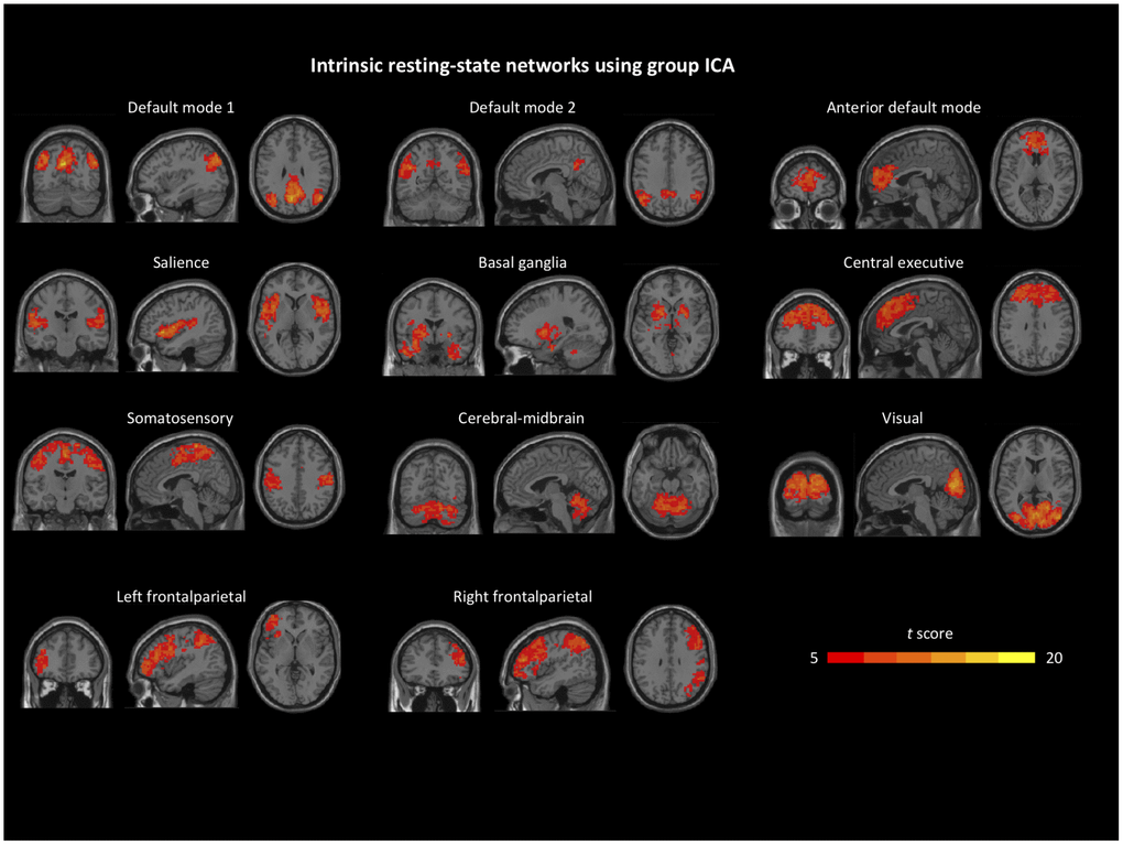 From the 20 independent components, we identified 11 resting-state network components (corrected FDR p < 0.001, cluster size > 100 for one-sample t-tests) based on previous findings [29], including the default mode network (DMN), anterior default mode network (aDMN), salience network (SAL), basal ganglia (BG), central executive network (CEN), frontalparietal network (FPN), somatosensory network (SSN), visual network (VIS), and cerebellum-midbrain network. We then performed two-sample t-tests on each resting-state network contrasting the two groups, back reconstructed independent component patterns at baseline (Figure 1).