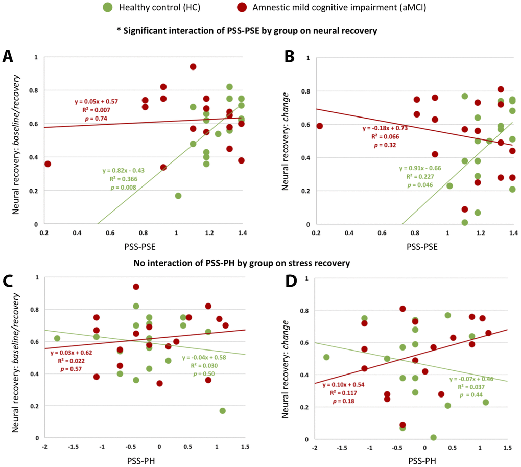 In the current study, we examined the role of AD risk in older adults’ capacity for stress adaptation, focusing global stress perceptions and neural recovery from an acute challenge. The aMCI group had significantly lower scores on the positively worded subscale of the PSS than HC, suggesting lower perceived capacity to cope with stress. aMCI and HC groups had similar scores on the negatively worded PSS subscale, suggesting no differences in perceived stress or helplessness. The two groups showed similar neural patterns of acute stress recovery. When exploring links between stress perceptions and neural recovery, only among the HC group was more perceived coping capacity associated with greater neural recovery from cognitive challenges. Coping perceptions and neural recovery were not associated among older adults with aMCI, suggesting that links between stress and coping-related perceptions and neural function may be weakened during the development of AD.