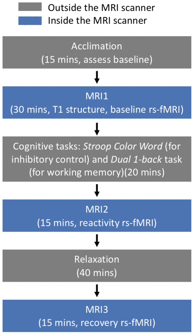 The study consisted of two cross-sectional sessions within a two-week window. The first session included psychological and behavioral interviews. The second session included cognitive challenge tasks and resting-state functional magnetic resonance imaging (rs-fMRI) scans. The protocol included: acclimation (15 minutes, assess baseline), MRI1 (30 minutes for T1 structure and baseline rs-fMRI), cognitive challenge tasks outside the MRI scanner (20 minutes), MRI2 (15 minutes for reactivity rs-fMRI), relaxation outside the MRI scanner (40 minutes), and MRI3 (15 minutes for recovery rs-fMRI) (Figure 3). Of note, electrocardiography data was collected at acclimation, cognitive challenge tasks, and relaxation phases. The cognitive tasks included two commonly used computerized tasks: Stroop Color Word (for inhibitory control) and Dual 1-back task (for working memory). For the Stroop task, participants were shown serial colored words on the screen and asked to judge the color of the font, regardless of the meaning of the word, as quickly and accurately as possible. For the Dual 1-back task, participants were shown an English letter on the screen and asked to judge whether the current stimulus matched the letter and position of the previous one as quickly and accurately as possible. For both tasks, feedback was displayed after participants responded to each individual trial. Reaction time and accuracy from the two tasks were recorded for further analysis. Each task lasted 10 minutes, and the order of the two tasks was randomized across participants. Instructions and practice were provided before each formal task. The group difference in performance (intra-individual difference in reaction time, IIVRT) for the two tasks are reported in Table 1.
