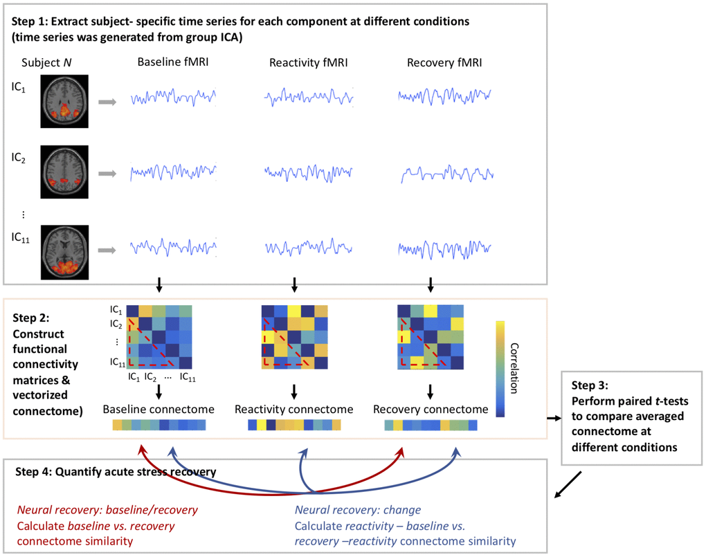 For each participant, we extracted subject-specific time series for each component (such subject and component-specific time series was generated from group ICA) at different conditions (i.e., baseline, reactivity, and recovery). The functional network connectivity matrices were constructed by computing the Pearson correlation coefficient between all pairs of identified time series. The functional connectivity matrices for each subject were then Fisher’s Z-transformed and vectorized. Across all participants, paired t-tests were conducted to compare averaged functional connectivity matrices at different conditions (baseline vs. reactivity: t(54) = -9.74, p < .001; reactivity vs. recovery: t(54) = 1.29, p = .20). The insignificant difference between reactivity vs. recovery statuses was reasonable since some participants did not recover sufficiently to baseline status within that period of time.