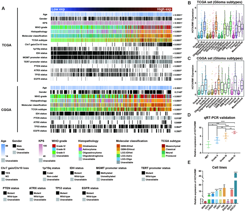 We compared clinical and molecular features between patients with high and low HOTAIRM1 expression and found that World Health Organization (WHO) grade, histopathology, IDH mutation status, MGMT promoter methylation status, and 1p/19q co-deletion status were associated with HOTAIRM1 level (Supplementary Table 3). Thus, HOTAIRM1 expression is correlated with clinical and molecular features of glioma.