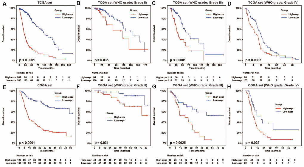 To determine the association between HOTAIRM1 expression and overall survival (OS) of glioma patients, we dichotomized median HOTAIRM1 levels into high expression (high-exp) and low expression (low-exp) groups. OS was shorter in the high-exp group compared to the low-exp group (median OS = 21.3 vs. 106.7 months, P < 0.0001; Figure 2A). We also examined the prognostic value of HOTAIRM1 in stratified groups (Grades II, III, and IV) and observed similar trends in the Kaplan–Meier survival curves (Figure 2A–2D). These results were confirmed in the CGGA dataset (Figure 2E–2H).