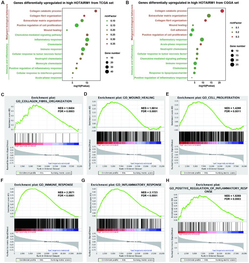 Gene expression profiles were analyzed to examine the phenotypes associated with HOTAIRM1 overexpression. TCGA data were used as the discovery set and CGGA data were used for validation in the whole-transcriptome principal components analysis (PCA). We found that patients with high and low HOTAIRM1 expression had distinct transcriptome profiles (Supplementary Figure 4A, 4B). Differentially expressed genes (DEGs) that were significantly upregulated (up-DEGs) in the high-exp group (log2 fold change > 2, P < 0.05; Supplementary Dataset 1) were associated with malignant tumor behavior and immune and inflammatory responses—e.g., collagen catabolism, wound healing, positive regulation of cell proliferation, cell adhesion, inflammatory response, cellular response to tumor necrosis factor, chemokine-mediated signaling, neutrophil chemotaxis, monocyte chemotaxis, response to lipopolysaccharide, acute-phase response, and immune response (Figure 4A, 4B). These results were validated by gene set enrichment analysis (GSEA) (Figure 4C–4H and Supplementary Figure 4C–4N).