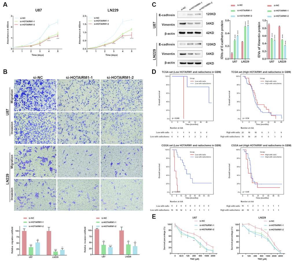 Given that EMT is associated with drug resistance, we explored the relationship between HOTAIRM1 expression and patient prognosis under different treatments. In patients who received radio- or chemotherapy, elevated HOTAIRM1 level was an indicator of poor prognosis (Figure 3E–3H). Additionally, patients in the low-exp group who received radiochemotherapy had longer OS than those treated with radiation alone, but this was not observed in patients with high HOTAIRM1 expression (Figure 5D). The results of the chemo-sensitivity assay showed that HOTAIRM1 knockdown in U87 and LN229 cells increased sensitivity to TMZ treatment, as evidenced by a 2-fold decrease in the half-maximal inhibitory concentration (IC50) of TMZ (Supplementary Table 5).