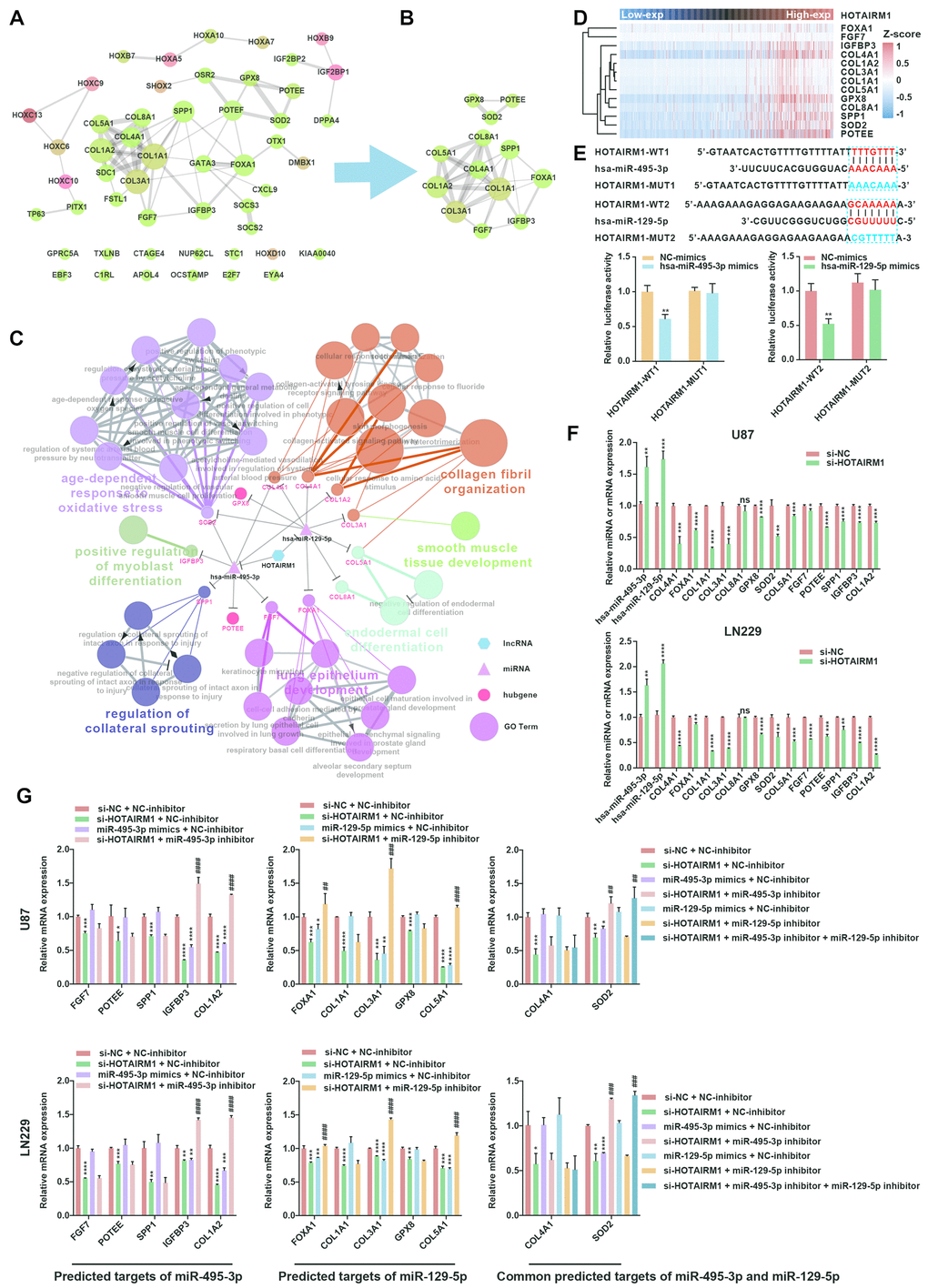 We constructed a lncRNA–miRNA–mRNA (i.e., ceRNA) network (Figure 6C) to gain insight into the relationship between HOTAIRM1, its target miRNAs, and up-DEGs. A protein–protein interaction (PPI) network was developed to evaluate interactions among the 51 target genes (Figure 7A). The Molecular Complex Detection (MCODE) approach was used to identify hub genes from the PPI network. Using k-core = 2 and degree cutoff = 3, we identified a sub-network containing 13 nodes and 31 edges (Figure 7B). A HOTAIRM1–miRNA–hub gene network was established to determine the association between HOTAIRM1, miRNAs, and hub genes (Figure 7C). The network had 15 lncRNA–miRNA–mRNA regulatory axes comprising HOTAIRM1, two miRNAs (hsa-miR-129-5p and hsa-miR-495-3p), and 13 hub genes. Gene Ontology (GO) analysis of the hub genes using ClueGO showed that most of the biological functions were enriched in cytoskeleton and cell differentiation, which play an important role in cell migration and invasion (Figure 7C). We also analyzed the hsa-miR-129-5p and hsa-miR-495-3p binding sites in HOTAIRM1 and hub gene transcripts (Figure 7E and Supplementary Figure 7) and determined with a luciferase reporter assay that both hsa-miR-129-5p and hsa-miR-495-3p directly bind to HOTAIRM1 (Figure 7E); furthermore, both were upregulated by HOTAIRM1 knockdown (Figure 7F). Conversely, suppression of HOTAIRM1 decreased the expression of 12 of the 13 hub genes that were upregulated in the high-exp group (Figure 7D, 7F). However, in HOTAIRM1-depleted U87 and LN229 cells, only insulin-like growth factor-binding protein (IGFBP)3, collagen type I α2 chain, and superoxide dismutase (SOD)2 levels were restored by hsa-miR-495-3p inhibition whereas Forkhead box A1, collagen type III α1 chain, and collagen type V α1 chain levels were restored by inhibiting hsa-miR-129-5p. These data suggest that HOTAIRM1 functions as a ceRNA to promote glioma cell migration and invasion.