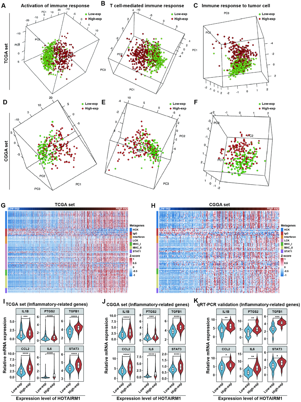 GO analyses revealed that immune response and inflammatory activity in glioma were influenced by HOTAIRM1 level (Figure 4A, 4B). Some of the above-mentioned hub genes, including secreted phosphoprotein (SPP)1, IGFBP3, SOD2, and fibroblast growth factor 7 are involved in the regulation of the tumor immune response [17–20]. We examined the relationship between HOTAIRM1 and local immune status by performing PCA of gene sets related to immune activation, T cell-mediated immune response, and immune response to tumor cells extracted from Molecular Signatures Database v.6.2 (http://software.broadinstitute.org/gsea/index.jsp; Supplementary Dataset 3). The results showed that the pattern of immune responses varied according to HOTAIRM1 expression level, which was confirmed by GSEA (Figure 8A–8F and Supplementary Figure 8). An analysis of inflammatory response [21, 22] according to the expression level of HOTAIRM1 revealed that most inflammation-related genes were positively associated with HOTAIRM1 expression except for immunoglobulin G, which was related to B lymphocyte activity (Figure 8G, 8H and Supplementary Figure 9). We then compared the expression levels of six inflammation-related genes including interleukin 1 beta, prostaglandin-endoperoxide synthase 2 (also known as cyclooxygenase 2b), transforming growth factor beta 1, C-C motif chemokine ligand 2, interleukin 6, and signal transducer and activator of transcription 3 [23, 24] between high- and low-exp groups in TCGA and CGGA. All six of these genes were more highly expressed in the high-exp group than in the low-exp group, which was confirmed by quantitative real-time polymerase chain reaction (qRT-PCR) in an independent glioma cohort (Figure 8I–8K). Thus, aberrant HOTAIRM1 expression is associated with a distinct immune and inflammatory phenotype in glioma.