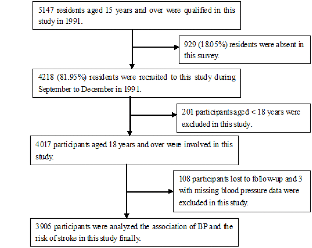 Overall, 5147 individuals were ≥15yearsold, and 4218 were recruited into this survey (response rate, 82%). Of these, 4017 individuals were ultimately enrolled, after excluding 201 individuals <18 years old. During the course of the study, 108 participants were lost to follow-up, and three with missing baseline BP data were removed from the BP analysis. Finally, a total of 3906 participants were evaluated to determine the association between BP and the incidence of first-ever stroke (Figure 1).