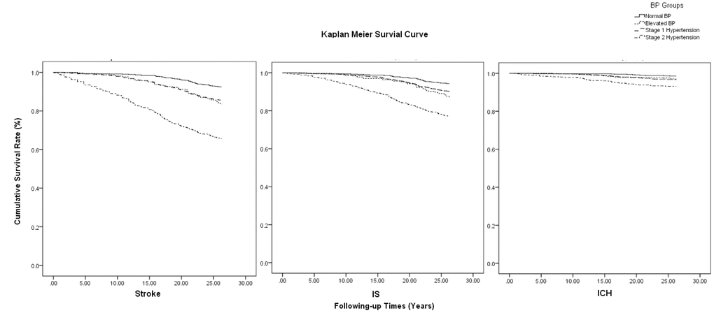 Additionally, elevated BP levels were associated with total stroke risk, as well as for IS and ICH risk, with respective log-rank values of 286.270,147.023, and 41.761 (all, P<0.001) (Figure 2).