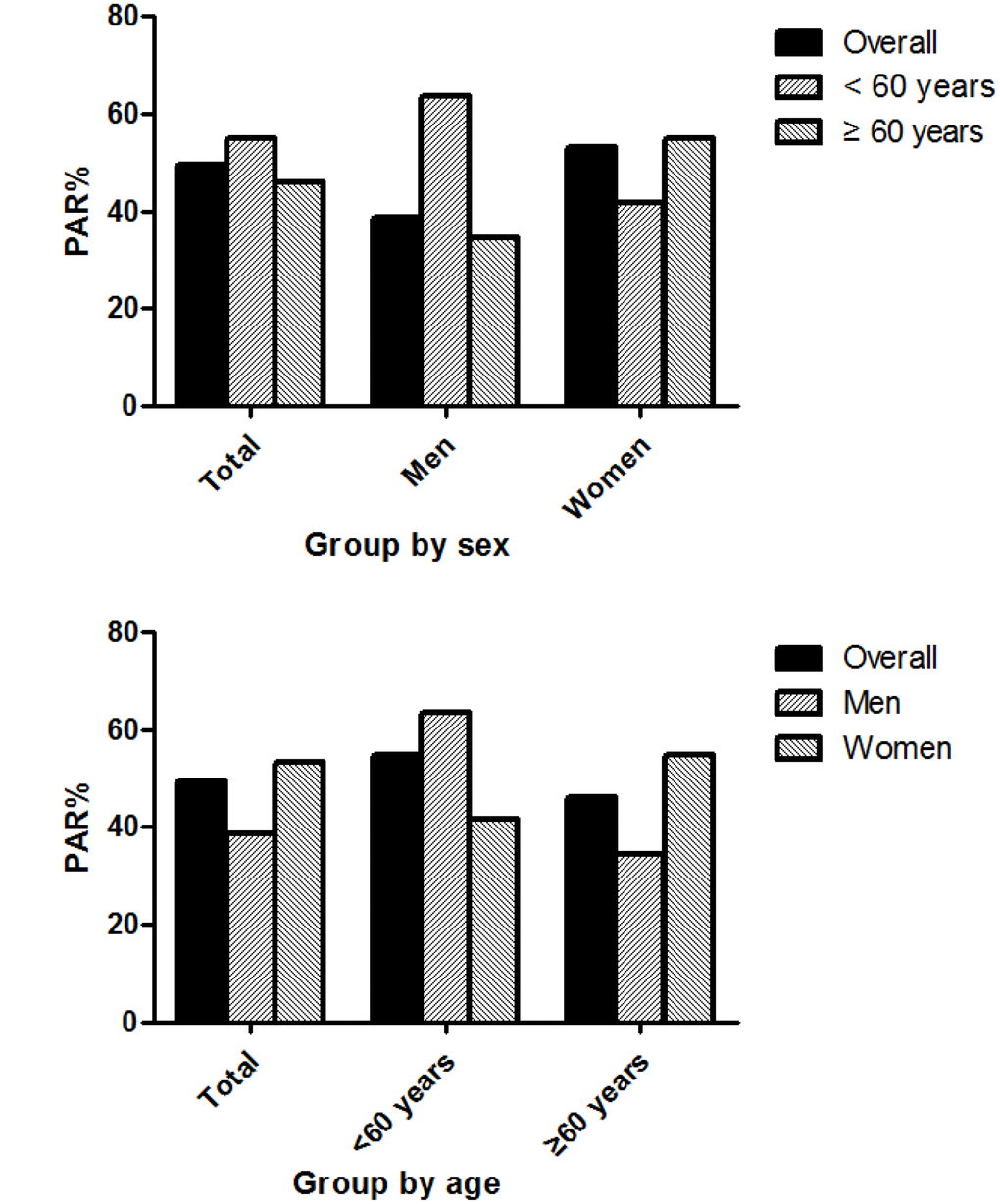 Figure 3 shows that the PAR% for the incidence of first-ever stroke associated with abnormal BP (including elevated BP and stages 1 and 2 hypertension) was 49.4%, overall; the values for men and women were 38.5% and 53.3%, respectively. Among individuals <60 years old, the PAR was 54.8%, overall (63.6% for men and 41.7% for women). Among those aged ≥60 years, the corresponding PAR% values were 46.0% (overall risk), 34.4% (men), and 54.9% (women), respectively.