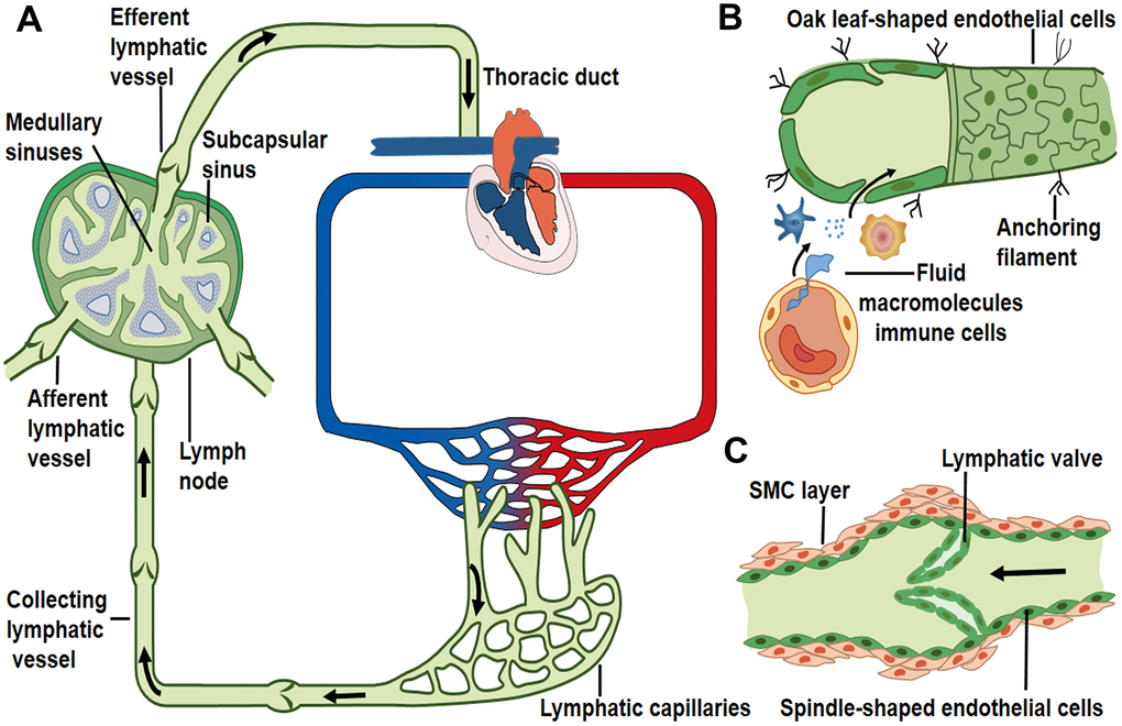 The constituents of lymph include extravasated fluid, macromolecules and immune cells [2]. These elements in peripheral tissues enter initial lymphatic vessels through the opening of primary valves or the vesicular transport of endothelial cells [4, 24, 29]. Lymphatic collectors gather initial lymphatic fluid and propel lymph forward by spontaneous contractions of the surrounding muscle layers [30]. This driving force promotes the unidirectional flow of lymph fluid into the afferent lymphatic vessels of lymph nodes [1, 31]. The afferent lymphatic vessels convey lymph into the sub-capsular sinus and along the lymph node sinus toward the efferent lymphatic vessels [1, 32]. The lymph then drains into the thoracic duct or the right lymphatic duct, and returns to venous circulation through left and right subclavian veins, respectively [1, 33, 34] (Figure 1A).