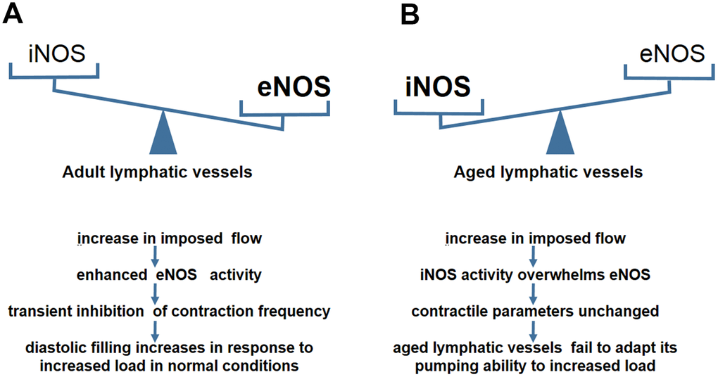 eNOS in lymphatic endothelial cells is required for maintaining normal contractile events under physiological conditions [46]. During the contraction cycle, the intrinsic spontaneous pumping activities promote sustained forward flow which change pulsatile shear stress [47]. The lymphatic endothelium is highly sensitive to flow/stress and potentially generates NO [26]. The phasic generation of NO acts on lymphatic muscle layers concomitantly with the reduction of contractile frequency and tone [30, 48]. This spontaneous transient suppression of pump events is essential for increased diastolic filling of lympangions [49]. NO inhibits vasomotion primarily through the NO-induced production of cyclic GMP (cGMP) and the subsequent activation of both cGMP- and cAMP-dependent protein kinases (PKG and PKA) [49, 50]. The NO/cGMP regulatory pathway inhibits Ca++ release from intramyocellular stores and affects the pacemaker events of lymphatic muscle cells, leading to a decrease in contractile amplitude and frequency [49, 51, 52]. Gasheva et al compared the NO-dependent self-regulatory mechanism between an adult group and an aged group in the thoracic duct (TD) [13]. In adult rats, NO is produced from eNOS activity in the lymphatic endothelial cells in response to imposed flow [45], (Figure 2A). With an increase in imposed flow, the enhanced eNOS activity mediates the inhibition of the lymph pump in adult rats [48]. This inhibition reduces lymphatic pacemaker activity and contraction frequency [13]. This kind of spontaneous transient depolarization is essential for increased diastolic filling and the subsequent production of a larger contraction amplitude [45]. In contrast, the TD segment in old rats behaves differently in response to the imposed flow [13] (Figure 2B). No significant inhibition of lymph pump occurs in the aged group at high levels of imposed flow [13]. Furthermore, the contraction frequency and fractional lymph flow is unchanged in comparison with the adult group [13]. This aging-related alteration illustrates that the self-regulatory adjustment of lymphatic vessels is reduced to the changes in lymph flow [45]. Further experiments demonstrated that the reversal of eNOS/iNOS activity causes contractile functional impairment in the aged group [13].