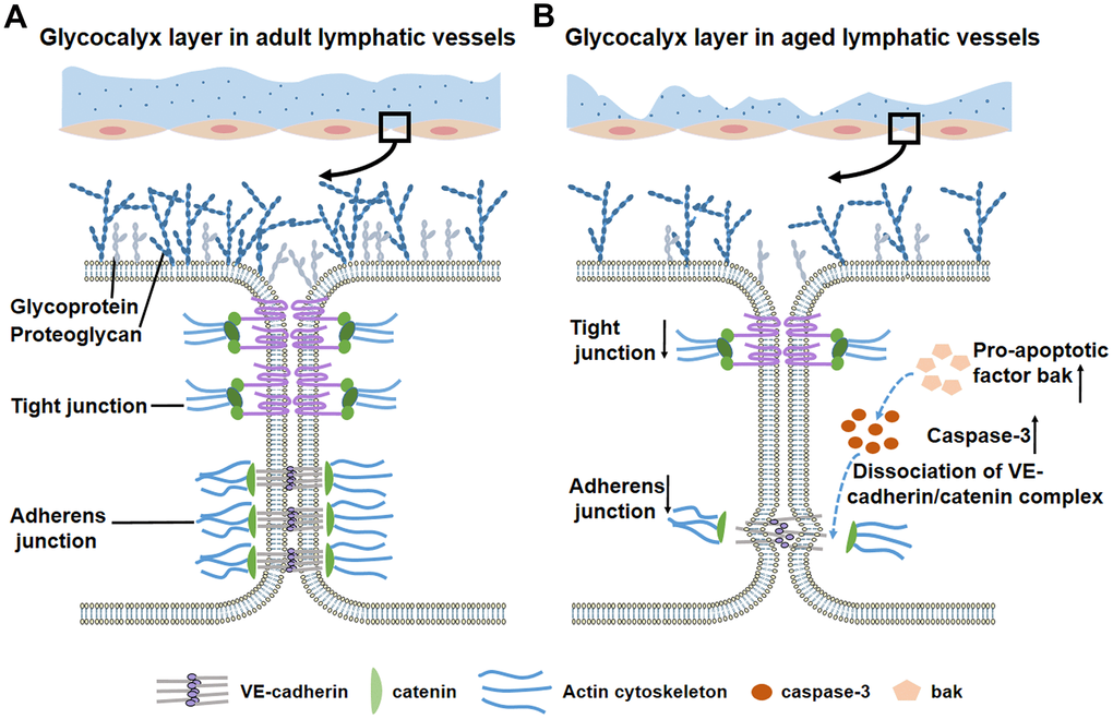 The aging process induces changes in structure and function of lymphatic networks [6]. Lymphatic-related diseases are prevalent in elderly, such as lymphedema [7]. In 1960s, the specific “varicose bulges” in muscular lymphatic vessels was observed and this bulges were increased with age [8, 9]. Muscle cell atrophy, elastic elements destruction, and aneurysm-like formations were also found in aged lymphatic vessels [10–12]. Aging associated alterations in lymphatic contractility decrease pump efficiency which result in excessive retention of tissue fluid within interstitial spaces [13, 14]. Reduced responsiveness to inflammatory stimuli in aged lymphatic vessels decreases the normal capacity to react against foreign organisms [15]. The occurrence of high permeability is caused by the loss of glycocalyx and the dysfunction of junctional proteins [6, 16, 17]. In addition, increased caspase-3 activity, the dissociation of the VE-cadherin/catenin complex and the low expression of actin cytoskeleton that occur in aged blood vessels may also be seen in aged lymphatic vessels [16, 18]. Knowledge of the regulatory mechanisms underlying in these disorders is critical to our understanding of the aging-related diseases of lymphatic vessels.