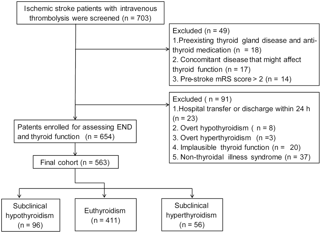 All statistical analysis was done with SPSS software, version 23.0 (SPSS Inc., Chicago, IL). Continuous variables were summarized as mean ± standard deviations (SD) or medians with interquartile ranges (IQR) and compared by Student's t test or Mann-Whitney U test as appropriate. Categorical variables were expressed as percentages and analyzed with the chi-square test or Fisher’s exact test, as appropriate. Binary logistic regression analysis was designed to describe adjusted estimates of the association of subclinical thyroid dysfunction with END and poor outcome at 3 months. Cox’s proportional hazard regression analysis was performed to estimate the hazard ratio for mortality. All regression analyses were first adjusted for age, sex, cardiovascular risk factors and center (Model 1), and additionally adjusted for variables with P < 0.05 in univariate analysis (Model 2). We also used Kaplan-Meier curve to calculate 3-month survival probabilities. In all analyses, P < 0.05 was considered as statistically significant.