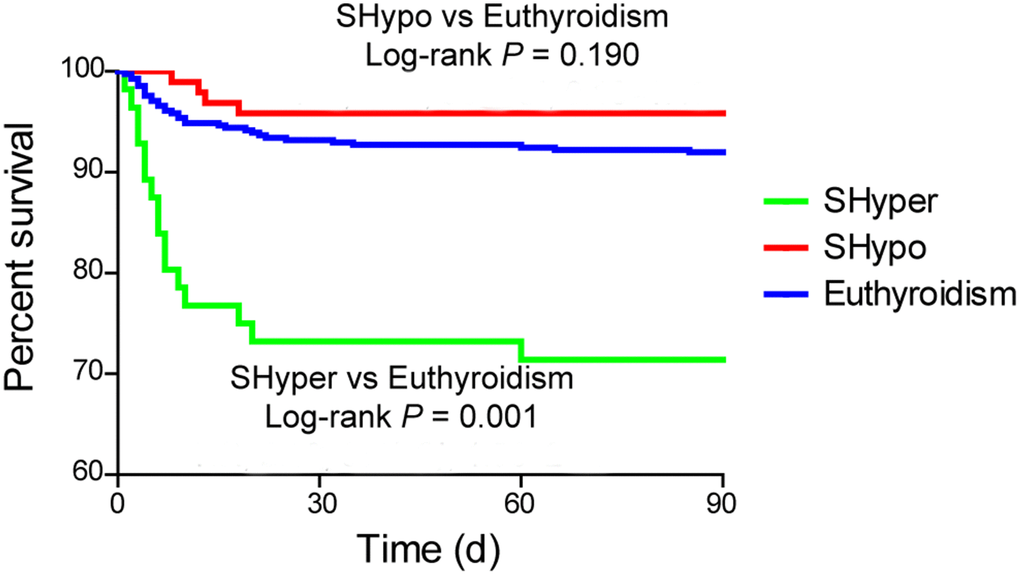 Kaplan-Meier curve revealed that mortality at 3 months was significantly higher in patients with SHyper when compared with euthyroidism. No association was detected in mortality between patients with SHypo and euthyroidism (Figure 2, log-rank test, P = 0.001).