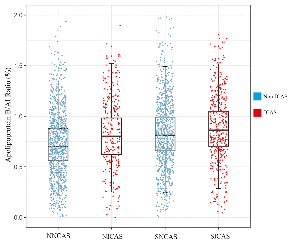 The current study demonstrated that the apoB/AI ratio was an independent risk factor for ICAS in both stroke and non-stroke Chinese individuals, suggesting the effects of apoB/AI ratio on increasing the risk of ICAS were the same between stroke and non-stroke individuals. We found that the risk of suffering ICAS will increase when apoB/AI ratio increased.