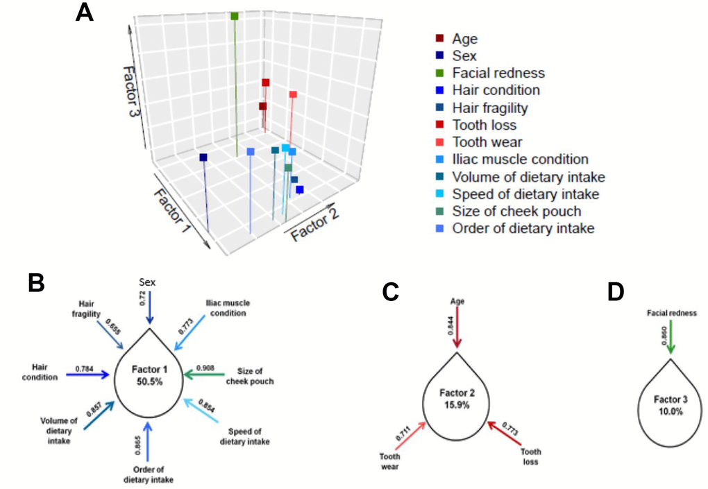 To validate the construction of the scale, we conducted an exploratory factor analysis of the 12 items. The adequacy of the scale was calculated by KMO (0.815), which indicated that these items harbor a dimension-reducible construct. We then divided the 12 items into three distinguishable factors using varimax rotation (Figure 2A). According to the results, three clustered factors together explained 76.4% of the variance in aging-related health and daily functioning. We further estimated the contribution to each factor using the “loading” statistic (Figure 2B–2D). Loadings above 0.5 were considered to contribute to a relatively independent role, helping “denoise” the complexity of aging-related health and functioning. Factor 1 comprised six significantly interrelated items, among which volume of dietary uptake explained the highest level of variance of the 12 items in the AHFS.