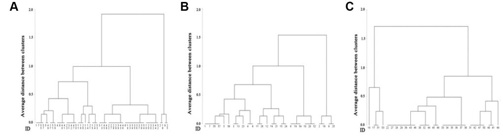 Hierarchical cluster analysis was conducted to validate the actual applicability of the scale. Individuals’ scores for aging-related health and function were clustered in all subjects as well as within each sex. According to the comparison of the respective presented dendrograms, three clusters were taken, and the optimal number of clusters reflected the severe-aging clustered subgroup, moderate-aging clustered subgroup and mild-aging clustered subgroup. Notably, the average scores of three clustered subgroups displayed significant disparity from each other in all samples, all females and all males (Table 4).