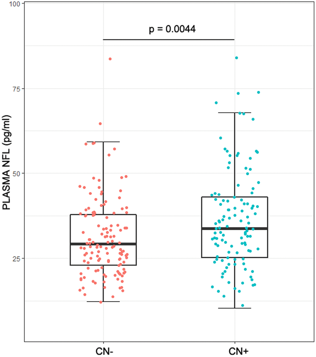Blood samples were collected, processed, aliquoted, and frozen at -80°C according to standardized procedures. Plasma NFL concentrations were measured on an ultrasensitive single-molecule array platform with a home brew kit (Simoa Homebrew Assay Development Kit; Quanterix Corporation) using the same methodology as described previously [25]. The assay used a combination of monoclonal antibodies and purified bovine NFL as a calibrator. The relative error of the blank calculated concentrations was below 20% for all calibrators, run in triplicate, resulting in lower limits of quantifications of 2.2 pg/ml and upper limits of quantification of 1620 pg/ml. All samples measured within the range spanned by the limits of quantifications, and for the low quality control samples with a concentration of 14 pg/ml, the intra-assay coefficient of variation was 11.0% and intermediate precision was 11.1%. For the high-concentration quality control samples with a concentration of 137 pg/ml, the intra-assay coefficient of variation was 8.8% and intermediate precision was 9.6%. The measurements were performed in September 2016.