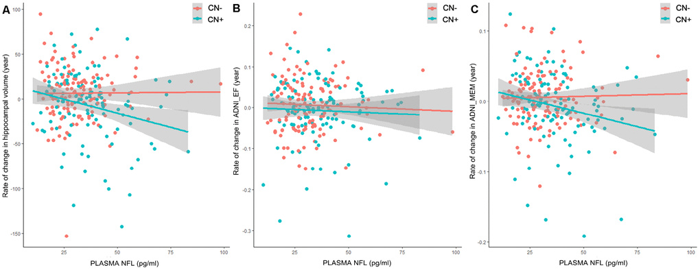 Table 2 showed the results of a multiple linear regression analysis for cross-sectional associations. Among total CN participants, a significant association was found between CSF Aβ42 and plasma NFL concentration (β = -0.1421, p = 0.0320), which was not found in the two subgroups. Moreover, significant associations between CSF t-tau and plasma NFL concentration were found in both total CN participants (β = 0.1821, p = 0.0091) and CN+ subgroup (β = 0.29319, p = 0.0042). There was no significant association of plasma NFL concentration with CSF p-tau181, FDG-PET, ADNI_MEM, ADNI_EF, and hippocampus volume.