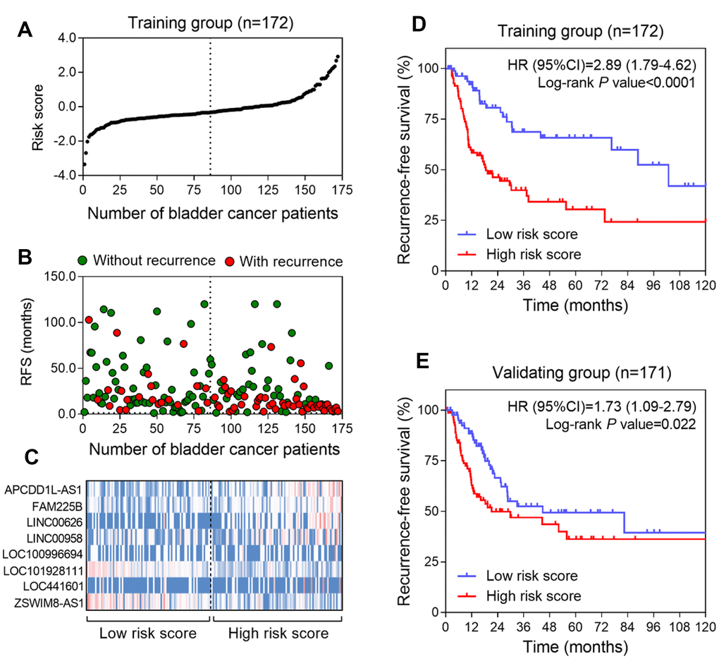To investigate whether the eight-lncRNA signature could provide an accurate prediction of RFS in BLCA patients, a risk-score formula was created according to the expression of these 8 lncRNAs for RFS prediction, as follows: Risk score = (0.37 × expression value of APCDD1L-AS1) + (2.13 × expression value of FAM225B) + (0.68 × expression value of LINC00626) + (0.03 × expression value of LINC00958) + (0.18 × expression value of LOC100996694) + (−0.56 × expression value of LOC101928111) + (0.11 × expression value of LOC441601) + (−4.26 × expression value of ZSWIM8-AS1). Then the eight-lncRNA signature risk score were calculated for each patient in the training series. As such, patients were ranked according to their risk scores and divided into a high-risk group (n = 86) or a low-risk group (n = 86) using the median risk score of the training series as the cutoff point (Figure 1A). As expected, a higher recurrence rate was noted for BLCA patients with high-risk scores than for those with low-risk scores (Figure 1B). Moreover, tumor tissues obtained from patients with high-risk scores tended to express high level of risky lncRNAs (APCDD1L-AS1, FAM225B, LINC00626, LINC00958, LOC100996694 and LOC441601) in their tumors, whereas tumor tissues from patients with low-risk scores tended to express high level of protective lncRNAs (LOC101928111 and ZSWIM8-AS1) (Figure 1C). Kaplan–Meier curves showed that, in the training series (n = 172), patients in the high-risk group had a significantly shorter RFS than those in the low-risk group (HR=2.89, 95%CI =1.79-4.61, log-rank test P<0.0001) (Figure 1D). In detail, RFS rates of patients in the high-risk group were 48.6% at 24 months, 33.1% at 48 months, 27.8% at 72 months and 25.3% at 96 months, versus 83.1%, 70.3%, 65.7% and 60.2% in the low-risk group, respectively.