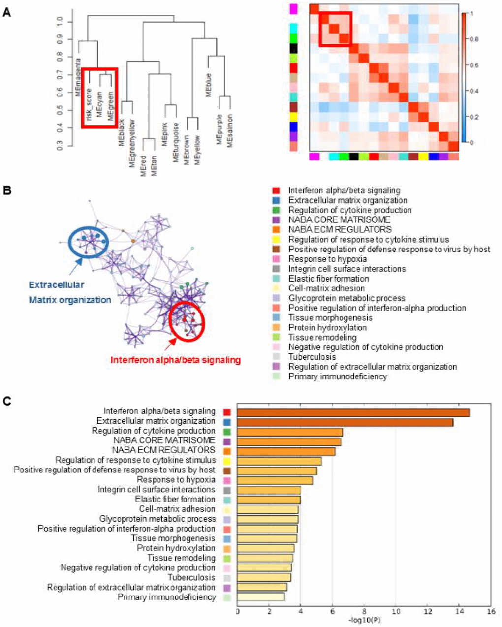 In order to explore the potential mechanisms of the eight lncRNA signature, we performed WGCNA method to cluster genes that highly correlated with the risk scores based on the profiling data of TCGA dataset. We identified a total of 14 modules and found that cyan and green modules were most significantly correlated with the risk-score (Figure 2A). Pathway enrichment analysis was then performed using the genes in cyan and green modules. As shown in Figure 2B and 2C, genes were significantly enriched in cancer-related networks, including extracellular matrix organization pathways, interferon alpha/beta signaling, cytokine production pathway et al., suggesting the activation of these pathways might contribute to higher mortality risk in patients with high risk scores.