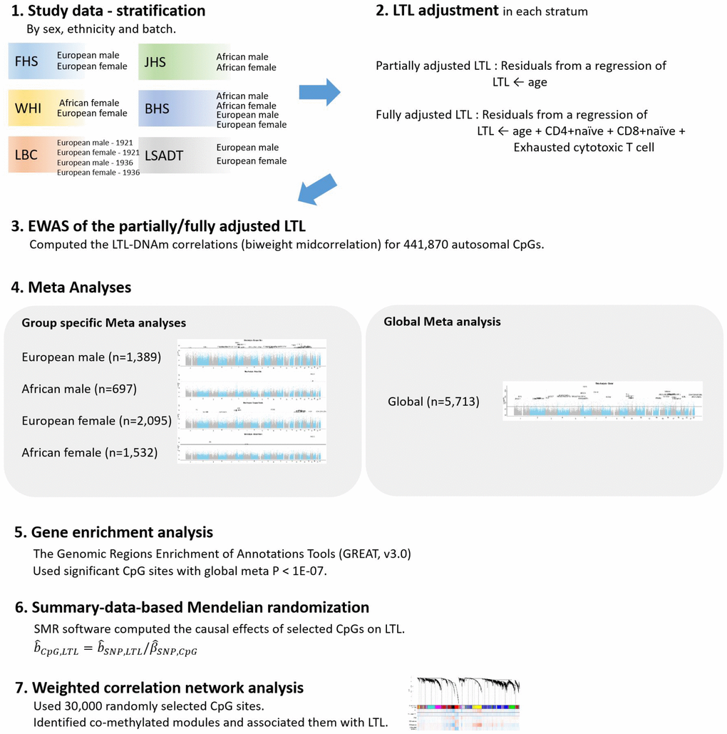 We considered two sets of adjustments for LTL confounders: 1) partially adjusted LTL for age, sex, and ethnicity and 2) fully adjusted LTL for age, sex, ethnicity, and imputed white blood cell counts (CD4+ naïve, CD8+ naïve and exhausted cytotoxic T cell). We conducted a large-scale multi-ancestry EWAS of the partially and fully adjusted LTL using seven cohorts – the Framingham Heart Study (FHS, n=874), the Jackson Heart Study (JHS, n=1,637), the Women’s Health Initiative (WHI, n=818), the Bogalusa Heart Study (BHS, n=831), the Lothian Birth Cohorts (LBC1921 and LBC1936, n=403 and n=906, respectively), and the Longitudinal Study of Aging Danish Twins (LSADT, n=244). The analysis flow is depicted in Figure 1. We note that adjustment in this script indicates a mixture of data stratification and regression adjustment.