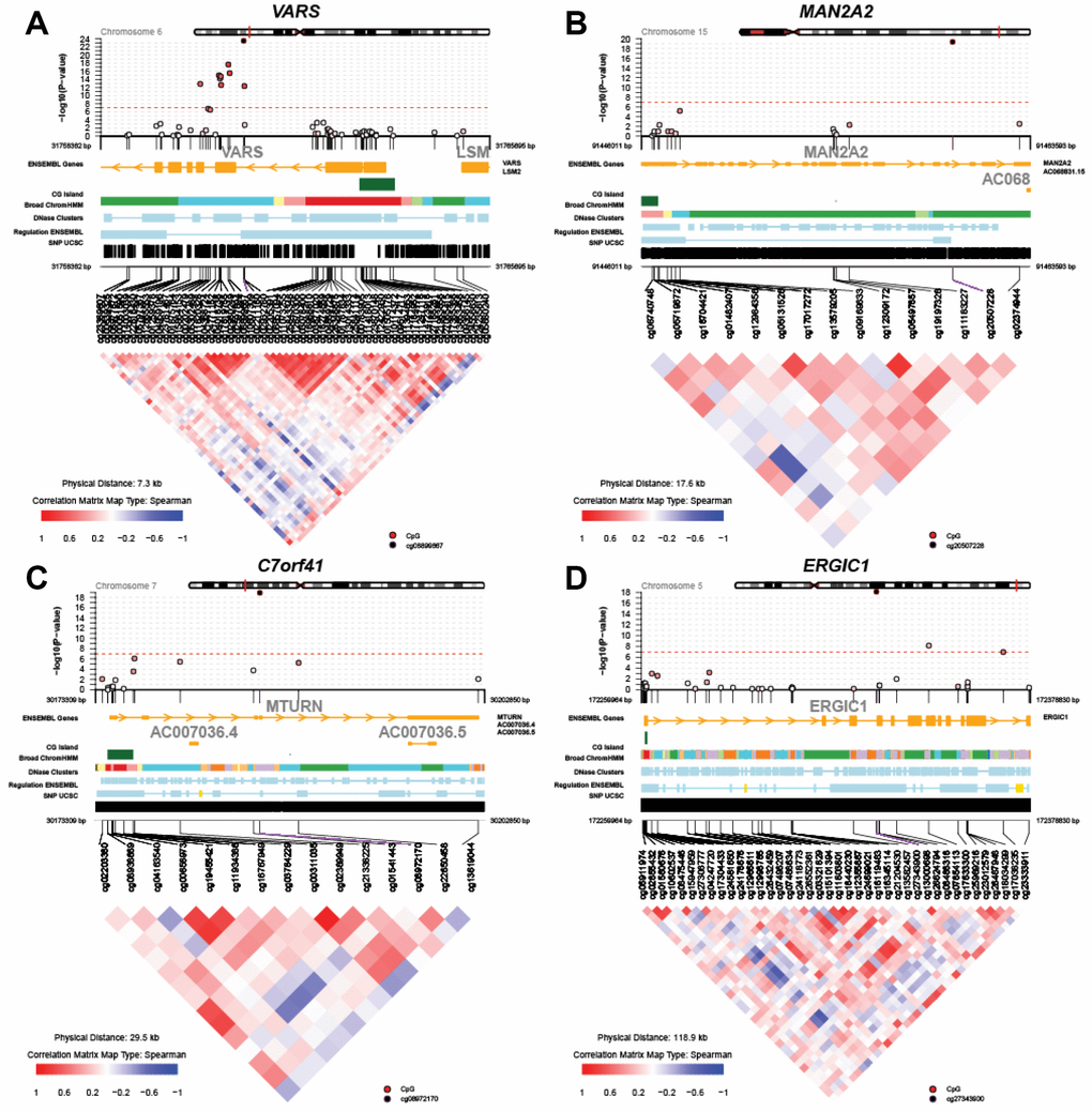 Figure 2 displays regional test statistics of LTL-associated CpGs on top of the local DNAm correlation structure for the top four genes listed in Table 1. VARS showed a cluster of CpGs above and right below the threshold of significance, while MAN2A2, C7orf41 (current name, MTURN) and ERGIC1 had one or two significant CpGs. The clusters detected in VARS might be because of the high probe density on the array and the strong inter-CpG correlations.