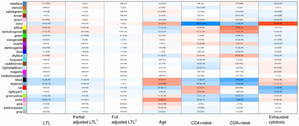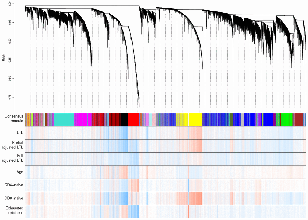Weighted correlation network analysis (WGCNA) identified four important co-methylated modules (labeled black, red, ivory and yellow in Figure 5) using FHS, JHS and WHI (n=3,329). Hypermethylation in the black module was associated with increased age, shortened LTL, decreased CD8+ naïve T cell counts, and increased exhausted cytotoxic T cell counts, whereas hypermethylation in the red module showed opposite correlations. Elevated methylation levels in the yellow module were correlated with longer LTL and higher CD8+ naïve T cell counts. The ivory module had a pattern similar to the one in the black module. None of the modules revealed any strong correlation with the fully adjusted LTL, which is not surprising as this measure of LTL is adjusted for age and white blood cell type composition. The relationships between co-methylated module representatives and traits of interest (LTL, the partially adjusted LTL, fully adjusted LTL, age, and white blood cell counts) are displayed in Figure 6.