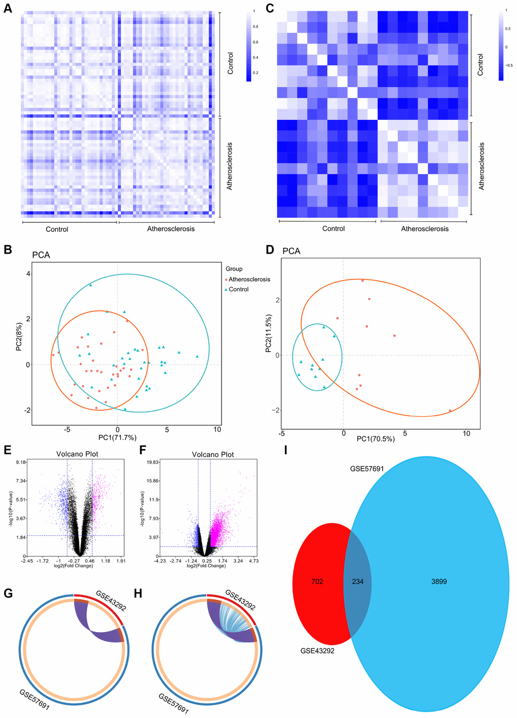 To further validate the intra-group data repeatability, we employed the Pearson’s correlation test and principal component analysis (PCA). Based on the Pearson’s correlation test, we found that in the GSE43292 dataset there were strong correlations among the samples in the control group and that there were also strong correlations among the samples in the atherosclerosis group (Figure 1A). Based on the PCA the intra-group data repeatability for GSE43292 was acceptable. The distances between per samples in the control group were close and the distances between per samples in the atherosclerosis group were also close in the dimension of principal component-1 (PC1) (Figure 1B). Based on Pearson’s correlation test, we found that for GSE57691 there was a strong correlation among the samples in the control group and a strong correlation among the samples in the atherosclerosis group (Figure 1C). The PCA showed the intra-group data repeatability to be acceptable in the GSE57691 dataset. The distances between per samples in the control group were close, and distances between per samples in the atherosclerosis group were also close in the dimension of PC1 (Figure 1D).