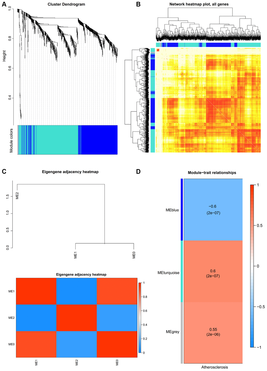 One key step is selection of the soft-thresholding power in the procedure of performing a WGCNA. The network topology analysis was performed for thresholding powers and identified the relatively balanced scale independence and mean connectivity. The power value 9, which was the lowest power for the scale-free topology fit index on 0.9, was selected to produce a hierarchical clustering tree (dendrogram) of 936 genes. We set the MEDissThres as 0.25 to merge similar modules, and 3 important modules were generated (Figure 2A). The network heatmap plot shows that there was no significant difference in interactions among different modules, indicating a high-scale independence degree among these modules (Figure 2B). Similar results were demonstrated by the eigengene adjacency heatmap (Figure 2C). The turquoise module was the most positively correlated with status of atherosclerosis, and the blue module was the most negatively correlated with status of atherosclerosis (Figure 2D).