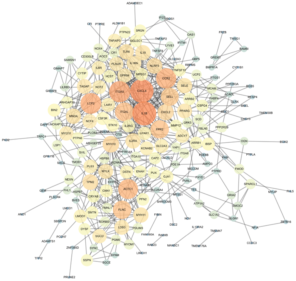 The PPI network of DEGs was constructed (Figure 4) and the most significant module and network of hub genes was identified using Cytoscape software (Figure 5A). A total of 13 genes were identified as hub genes with a degree of ≥13. Hierarchical clustering demonstrated that the hub genes could effectively differentiate the atherosclerotic samples from the non-atherosclerotic samples (Figure 5B and 5C). Among these genes, MYH10, ACTC1, FLNC and TPM2 exhibited the lower expression in the atherosclerosis samples, while the expressions of CXCL2, ITGAX, SELL, CCR2, LCP2, FPR2, NLRP3, IL1B, and CXCL8 were up-regulated in the atherosclerosis samples, suggesting that they may exert pivotal functions in the occurrence or progression of atherosclerosis.