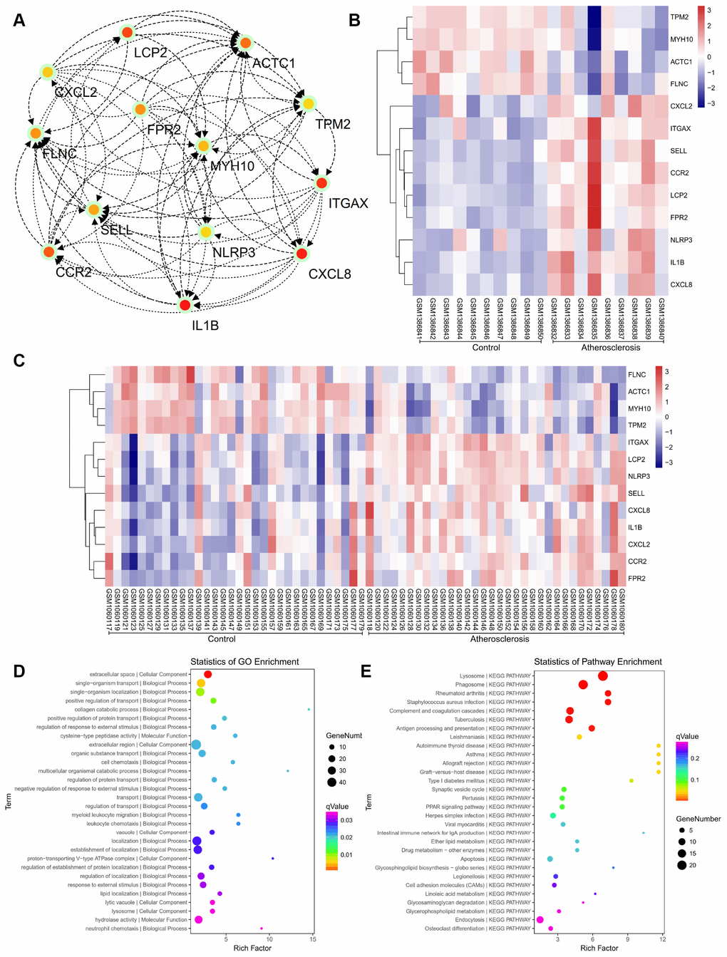 After the construction of animal model, proteomic analysis was performed. The results of GO analysis of DEGs from our animal model exhibited the most similarity with the GSE43292 and GSE57691 datasets. The detailed information of changes in the BP, CC, and MF, are presented in the Figure 5D. KEGG pathway analysis for our own dataset displayed that DEGs were primarily enriched in the lysosome, phagosome, rheumatoid arthritis, staphylococcus aureus infection, and so on. (Figure 5E). Hierarchical clustering presented in Figure 6A revealed the expression situation of DEGs between control and atherosclerotic samples in our private dataset. The upregulated genes are marked in red, and the downregulated genes are marked in green. The right legends of Figure 6A represent Protein ID, and the “157787195” presents TPM2.