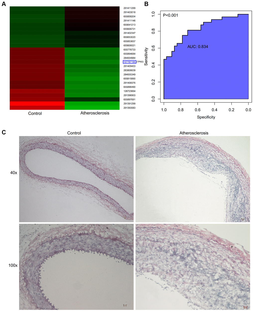 According to comparison between public and private datasets, the common DEG was identified, which is TPM2. The present study identified that TPM2 in the atherosclerotic tissues was displayed at significantly lower levels when compared with the matched normal tissues (P<0.05). The receiver operator characteristic curve indicates that the expression level of TPM2 in the GSE43292 could predict atherosclerosis sensitively and specifically (area under the curve for intimal thickness, 0.837; p<0.001) (Figure 6B).