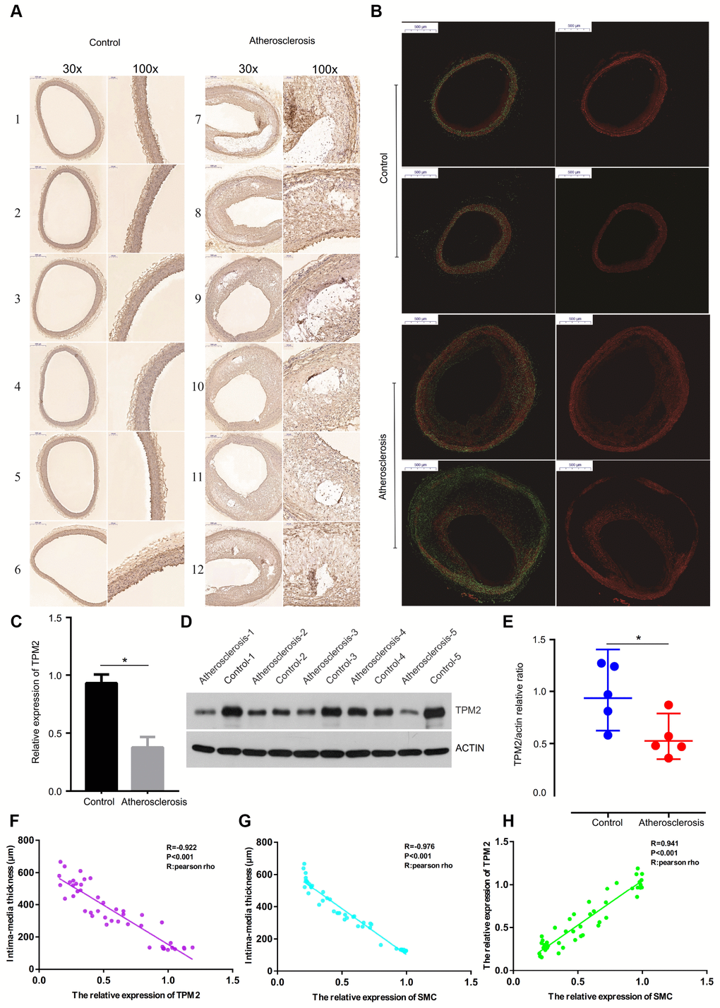 Total RNA was extracted from atherosclerosis samples and control artery samples by the RNAiso Plus (Trizol) kit (Thermofisher, Massachusetts, America), and reverse transcribed to cDNA. RT-qPCR was performed using a Light Cycler® 4800 System with specific primers for TPM2. Table 6 presents the primer sequences used in the experiments. The RQ values (2−ΔΔCt, where Ct is the threshold cycle) of each sample were calculated, and are presented as fold change in gene expression relative to the control group. GAPDH was used as an endogenous control.