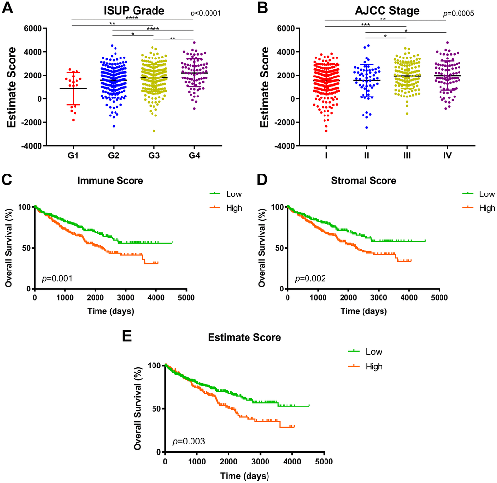 Clinicopathological parameters including ISUP grade and AJCC stage in 533 ccRCC patients from TCGA were analyzed and displayed according the immune, stromal and ESTIMATE score. One-way ANOVA test were utilized to measure statistically significance. X-tile software was utilized to take the cut-off value of immune score, stromal score and ESTIMATE score, in concordance of which overall participants were divided to two groups, respectively [34]. Survival comparison between distinct three scores identified as binary variables (high vs. low) was analyzed in 533 ccRCC patients. The primary end point for patients was progression-free survival (PFS), and overall survival (OS) was the secondary end point, which was evaluated from the date of first therapy to the date of death or last follow-up. The follow-up duration was estimated using the Kaplan-Meier method with 95% confidence intervals (95% CI) and log-rank test in distinct curves. All hypothetical tests were two-sided and P-values less than 0.05 were considered significant in all tests.