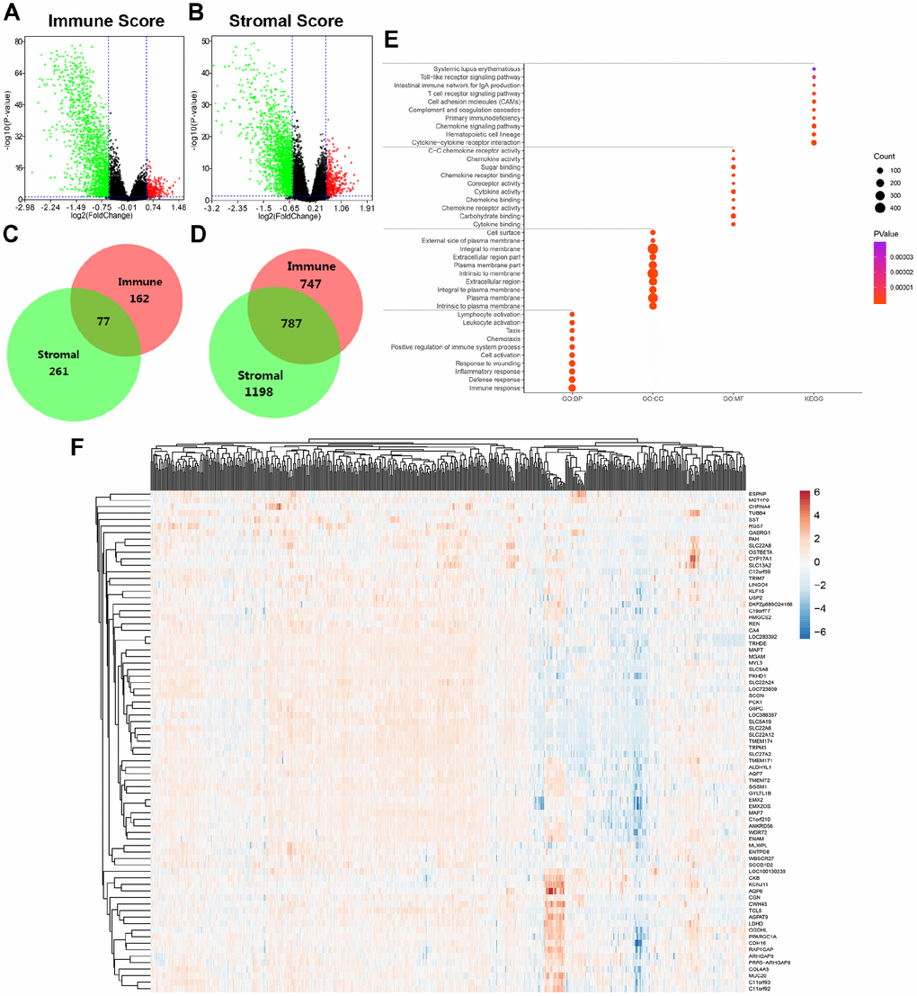 To explore differential expressed genes (DEGs) profiles with immune and/or stromal scores, we performed transcriptional microarray analysis of 533 ccRCC cases from TCGA cohort. Based on immune score comparison, 162 genes were up-regulated and 747 genes down-regulated in the high score than the low score group after propensity analysis using limma package algorithm (Figure 2A). Similarly, for high stromal score compared with low score, 261 up-regulated genes and 1198 down-regulated genes were obtained (Figure 2B). A total of 77 DEGs were commonly upregulated in the high scores groups (Figure 2C), and 787 genes were synchronously downregulated using Venn algorithm (Figure 2D).