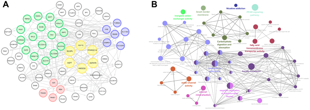PPI network was constructed using a total of 77 commonly up-regulated DEGs in Figure 3A. MCODE, plug-in of Cytoscape, was used to detect most significant co-regulated modular. It indicated four closely related subgroups displayed in different color, and the most significant modular including AGPAT9, AQP7, HMGCS2, KLF15, MLXIPL, PPARGC1A, was marked in yellow. Survival curves of other nodes were illustrated in Supplementary Figure 3. It suggested that decreased SLC27A2, G6PC, MGAM, TRPM3, PKHD1, MYL3, MAPT, SLC22A6, TRHDE, TMEM174, SLC22A8, OGDHL, SCGN, SLC51B, SLC22A12, REN, PAH, GABRG1, SLC13A2, SST, KCNJ11 significantly correlated with poor OS, while elevated TUBB4A and RGS7 expression significantly predicted poor prognosis (p<0.05).