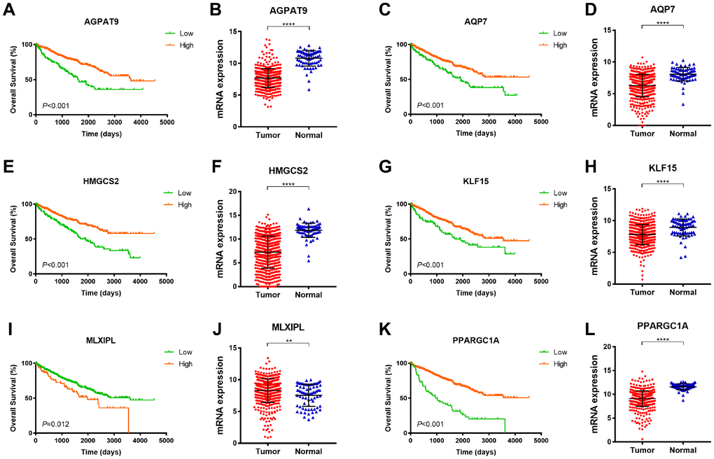 As demonstrated in Figure 4, among 6 significant hub genes, significantly decreased AGPAT9, AQP7, HMGCS2, KLF15, PPARGC1A mRNA expressions were found in ccRCC tissues compared with adjacent normal tissues, while MLXIPL mRNA expression was significantly elevated in tumor samples compared with normal samples. Kaplan-Meier method indicated that decreased AGPAT9, AQP7, HMGCS2, KLF15, PPARGC1A mRNA expression significantly correlated with poor OS (p<0.001), and elevated MLXIPL mRNA expression was significantly associated with shorter OS for ccRCC patients (p=0.012).
