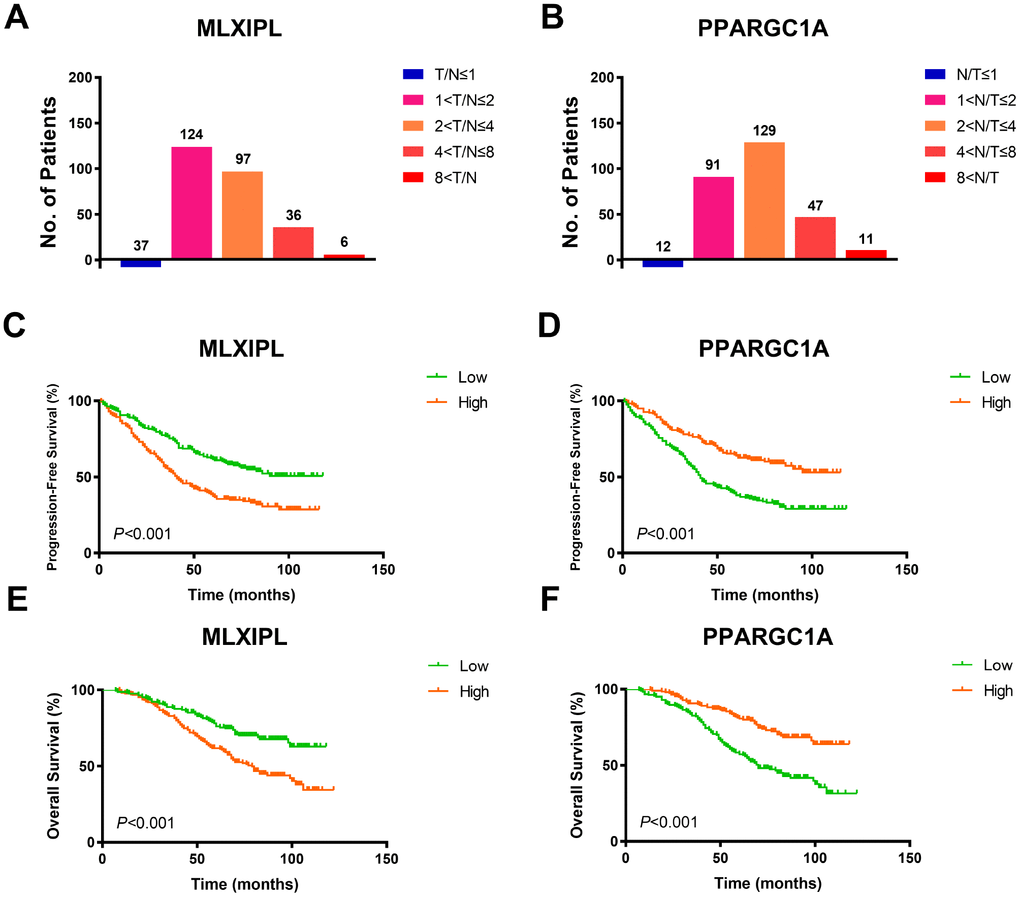 To validate AQP9 mRNA expression profile in ccRCC tissues, we performed RT-qPCR using 380 paired tumor and normal samples with available clinical follow-up data from a real-world cohort. It revealed dramatically increased MLXIPL and decreased PPARGC1A mRNA expression in ccRCC samples than normal tissues (Figure 5A–5B). Survival curves suggested that patients with elevated MLXIPL and decreased PPARGC1A mRNA levels significantly correlated with poorer PFS and OS (p<0.001; Figure 5C–5F).