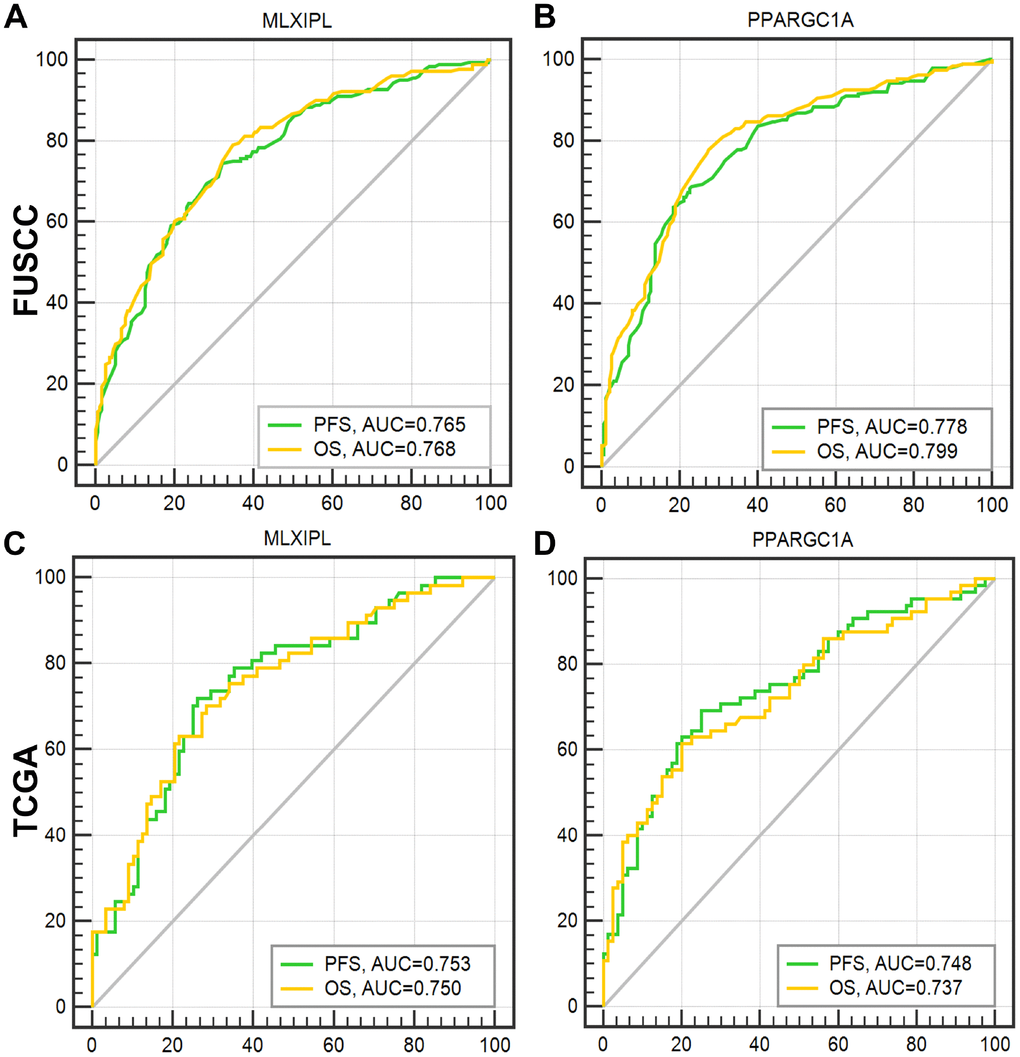 After integrating all the significant clinicopathological parameters and gene expression profiles in the multivariate Cox regression models of FUSCC cohort, we generated the formula: Integrated score(MLXIPL) = 2.105×pT stage (ref. T1-T2) + 1.922×pN stage (ref. N0) + 1.771×pM stage (ref. M0) + 2.413×AJCC stage (ref. I-II) + 1.934×ISUP grade (ref. 1-2) + 1.963×MLXIPL expression (ref. low) for PFS; Integrated score(MLXIPL) = 1.840×pT stage (ref. T1-T2) + 1.832×pN stage (ref. N0) + 2.001×pM stage (ref. M0) + 3.434×AJCC stage (ref. I-II) + 1.764×ISUP grade (ref. 1-2) + 1.545×MLXIPL expression (ref. low) for OS. For PPARGC1A, we generated formula: Integrated score(PPARGC1A) = 1.931×pT stage (ref. T1-T2) + 2.029×pN stage (ref. N0) + 1.641×pM stage (ref. M0) + 2.721×AJCC stage (ref. I-II) + 1.823×ISUP grade (ref. 1-2) + 0.524×PPARGC1A expression (ref. low) for PFS; Integrated score(PPARGC1A) = 1.862×pT stage (ref. T1-T2) + 1.821×pN stage (ref. N0) + 1.912×pM stage (ref. M0) + 3.511×AJCC stage (ref. I-II) + 1.749×ISUP grade (ref. 1-2) + 0.665×PPARGC1A expression (ref. low) for OS. The AUC index of MLXIPL and PPARGC1A for the FUSCC-PFS and FUSCC-OS were 0.765, 0.768 and 0.778, 0.799, respectively (p<0.001; Figure 6A–6B). External validation was implemented in TCGA cohort. The AUC index of MLXIPL and PPARGC1A for the TCGA-PFS and TCGA-OS were 0.753, 0.750 and 0.748, 0.737, respectively (p<0.001; Figure 6C–6D). Survival curves suggested that integrated scores of MLXIPL and PPARGC1A expression significantly correlated prognosis in FUSCC cohort, and were validated significant in predicting prognosis in TCGA cohort (Supplementary Figure 4).