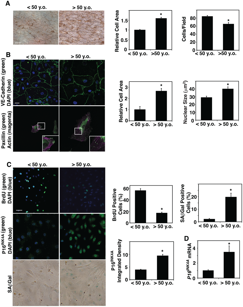 ECM stiffness [12] and blood flow [5], which are altered in aged tissues, change EC size and shape. However, the direct effects of aging on EC size in blood vessels have not been explored. We dissected small blood vessels with a length of circumference of 300 μm (a diameter of approximately 50 μm) from human adipose tissues of various ages (Table 1) and measured EC size in blood vessels by staining with silver nitrate [44, 45], which stains cell-cell junctions, ex vivo. The areas of ECs of small blood vessels in adipose tissues of age older than 50 years old (>50 y.o.) were 1.6-times larger than those from younger adults (< 50 y.o.) (Figure 1A). In contrast, EC density was 25% lower in the aged adipose tissue blood vessels (Figure 1A). Isolated aged human adipose ECs cultured on fibronectin (FN)-coated tissue culture dishes were also larger (2.6-fold) compared to young ECs when analyzed using VE-cadherin staining (Figure 1B). The size of nuclei was also 1.4-times larger in cultured aged human adipose ECs compared to young ECs (Figure 1B). There was no significant difference in the actin stress fiber structures (e.g. thickness, numbers) in young vs. old ECs (Figure 1B), however, a major focal adhesion protein, paxillin, which was specifically localized in the punctate form at the distal ends of actin stress fibers in young adipose ECs, was distributed along the actin fibers in the cytoplasm in aged ECs (Figure 1B). Consistent with others’ reports [46, 47], EC proliferation measured by BrdU nuclear incorporation was lower by 69% in ECs isolated from aged human adipose tissue, while cellular senescence detected by P16INK4A immunocytochemical (ICC) analysis and SA-β galactosidase (Gal) staining increased in aged human adipose ECs; the intensity of P16INK4A and SA- βGal-positive cells increased by 2.2- and 10.7-times in aged vs. younger human ECs (Figure 1C). The mRNA levels of P16INK4A detected by qRT-PCR were also 3.5-times higher in aged human ECs (Figure 1D).