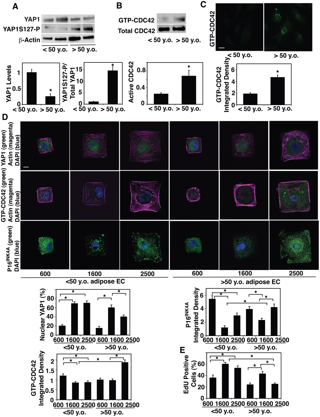 Aged ECs were larger than young ECs and cellular senescence detected by p16INK4A staining was higher in aged ECs compared to young ECs (Figure 1C, Supplementary Figure 1C). Consistently, p16INK4A intensity was higher in aged ECs cultured on large islands (2500 μm2) compared to that in young ECs cultured on the medium size island (1600 μm2), while reduction of aged EC size by culturing aged ECs on medium size islands decreased p16INK4A intensity by 41% (Figure 2D). EC proliferation detected by nuclear EdU staining in aged adipose ECs cultured on the large islands (2500 μm2) was lower than young ECs cultured on the medium size island (1600 μm2), while culturing aged ECs on medium size islands restored EdU nuclear incorporation (Figure 2E). These results suggest that age-dependent increases in EC size are associated with decreased YAP1 nuclear localization, increased CDC42 activity, induction of EC senescence, and reduction of EC proliferation in aged ECs.