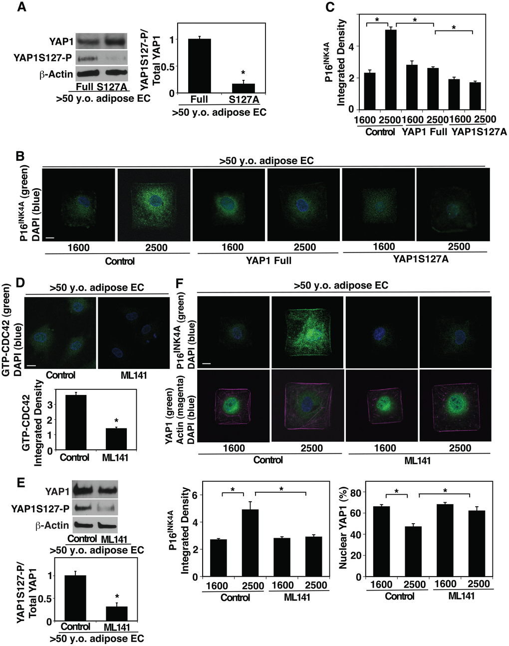 To examine whether YAP1 and CDC42 mediate the effects of age-dependent increase in EC size on EC proliferation and senescence, we manipulated YAP1 activity in aged ECs and cultured them on the island of different sizes. YAP1S127A mutant construct, in which YAP1 S127 phosphorylation residue is mutated to alanine and acts as a constitutively active form of YAP1 [29, 48], inhibited YAP1S127 phosphorylation in aged human adipose ECs compared to that in full-length YAP1-treated control ECs (Figure 3A). YAP1S127A mutant construct suppressed EC senescence detected by p16INK4A ICC analysis even when these aged ECs were cultured on the large island (2500 μm2) (Figure 3B, 3C). We also examined the effects of inhibition of YAP1 activity on cellular senescence and proliferation in young ECs. Lentiviral transduction of YAP1S94A mutant construct, which does not bind to TEAD transcription factor and acts as a dominant negative form of YAP1 [23], increased the levels of P16INK4A in young ECs compared to those treated with full-length YAP1 (Supplementary Figure 2F, 2G). YAP1S94A mutant construct also decreased young EC proliferation evaluated using an EdU proliferation assay (Supplementary Figure 2H).