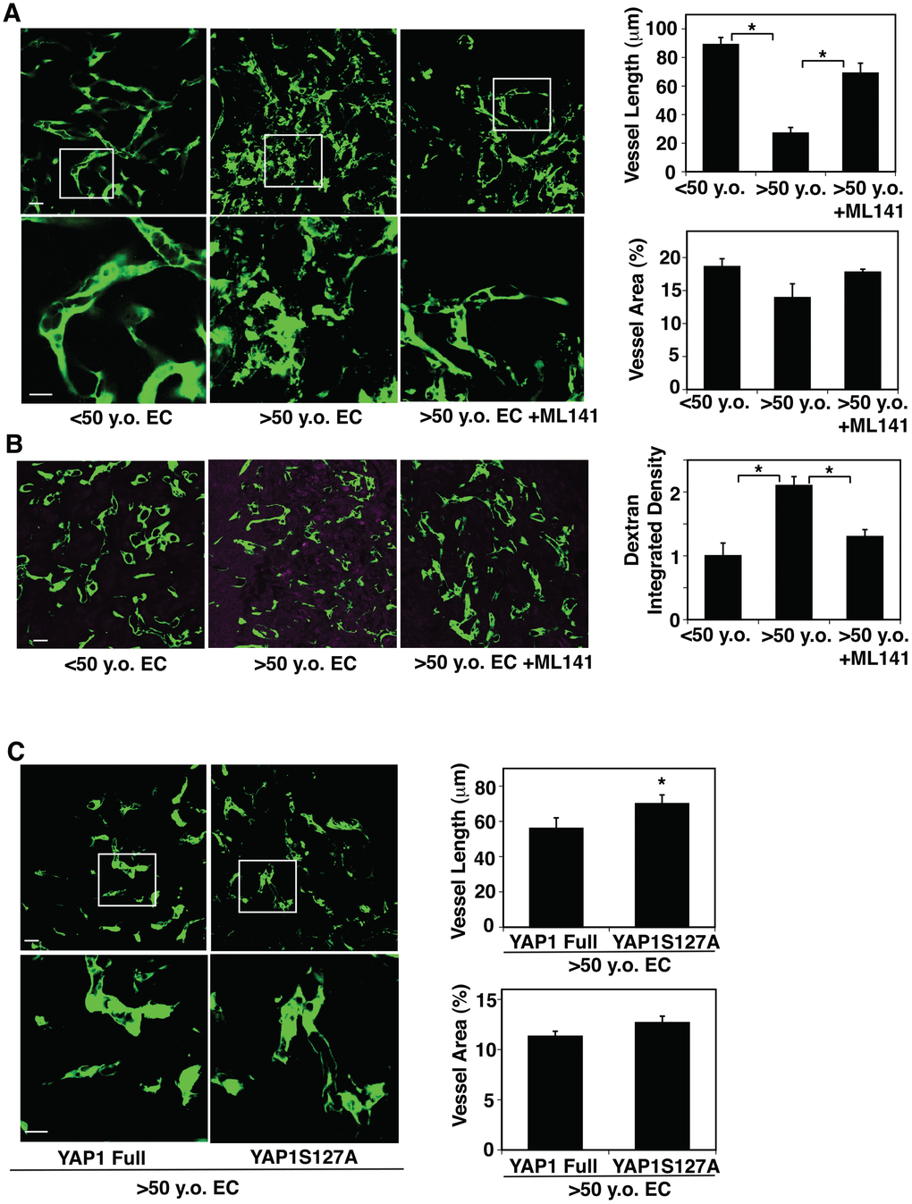 Angiogenesis is impaired in the aged mouse lungs [51]. YAP1 and CDC42 sense the age-dependent changes in EC size and control EC senescence (Figures. 2, 3). Therefore, we next examined whether YAP1 and CDC42 mediate age-dependent impairment of angiogenesis using a mouse gel implantation system [9, 23]. When we subcutaneously implanted fibrin gel supplemented with GFP-labeled human adipose ECs and human fibroblasts on the back of the NSG mouse [23], GFP-labeled human young adipose ECs supplemented into the gel formed a well-organized vascular lumen structures in the gel 7 days after implantation as analyzed using confocal fluorescence microscopy (Figure 4A). In contrast, GFP-labeled aged adipose ECs supplemented in the gel formed a disorganized vasculature with randomly oriented filopodia in the gel; vessel area was not significantly different in the gel supplemented with young vs. aged ECs, while vessel length was 76% shorter in aged ECs (Figure 4A). A CDC42 inhibitor, ML141, restored blood vessel structures in the gel supplemented with aged human adipose ECs; aged EC-derived blood vessels were 2.5-times longer in the gel treated with ML141 (Figure 4A). When we subcutaneously implanted gel supplemented with young vs. aged ECs and perfused with Alexa 594-labeled dextran by systemic injection, injected dextran was leaked more in the gel supplemented with aged ECs compared to that supplemented with yound ECs, while ML141 attenuated the leakage of dextran (Figure 4B), suggesting that inhibition of CDC42 restores vascular function in aged ECs in the gel.