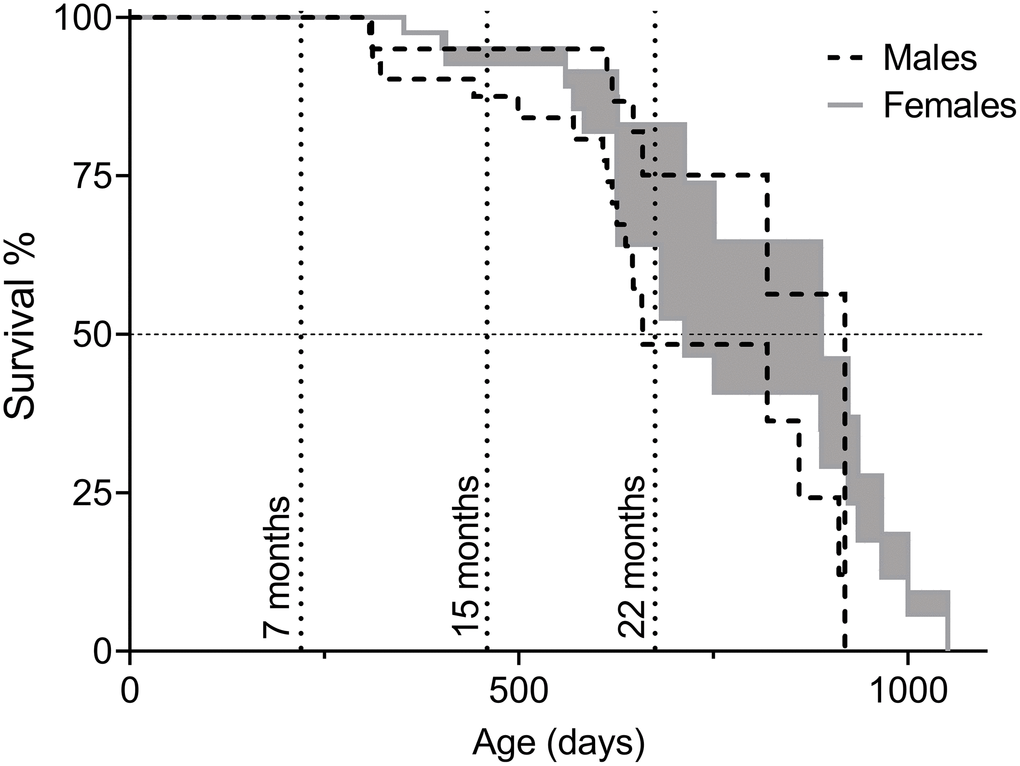 Cohorts of mice were analyzed for behavioral phenotyping at 7, 15, and 22 months of age representing mature adults, middle-aged, and old. The mice were naïve before behavioral testing at all timepoints. As shown in Table 2, no survival loss had yet occurred at the 7-month timepoint and the mice were considered healthy adults. At the 15-month timepoint, survival was around 90% and for the final behavioral analyses at 22 months, 71% of the male and 74% of the female mice remained.