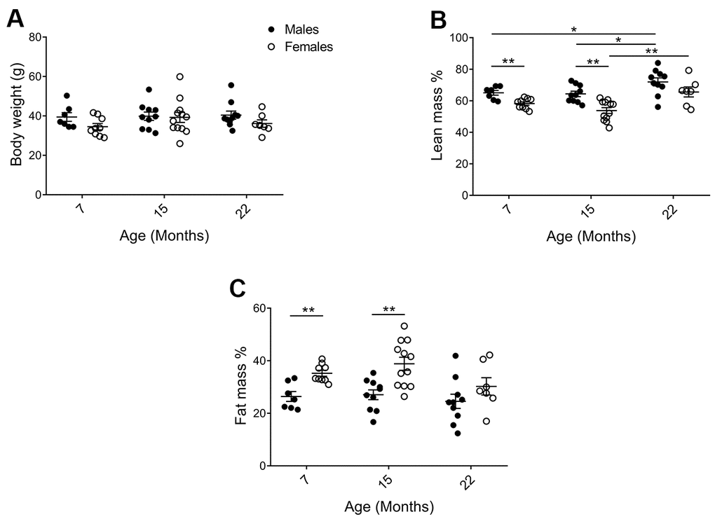 In our F2 hybrid study, the mice displayed a relatively stable body weight in all age groups; likely because the first timepoint truly represented “mature adults”, and the last “old” age group represented a healthily aged cohort, thanks to the strict animal ethics protocol. Although the average body weight was comparable, female mice had more fat mass and less lean mass as compared to males, at least up to 15 months of age. In line with our results, similar body weights with increased fat mass and reduced lean mass in females as compared to males were previously observed in 20-month-old F1 hybrid C57BL/6J×129S1/SvImJ mice [54]. Additionally, body composition comparisons at 4 months of age of inbred mice demonstrated that males tended to have more lean mass, though also higher body weight, in more than half of the 40 different strains analyzed [55].